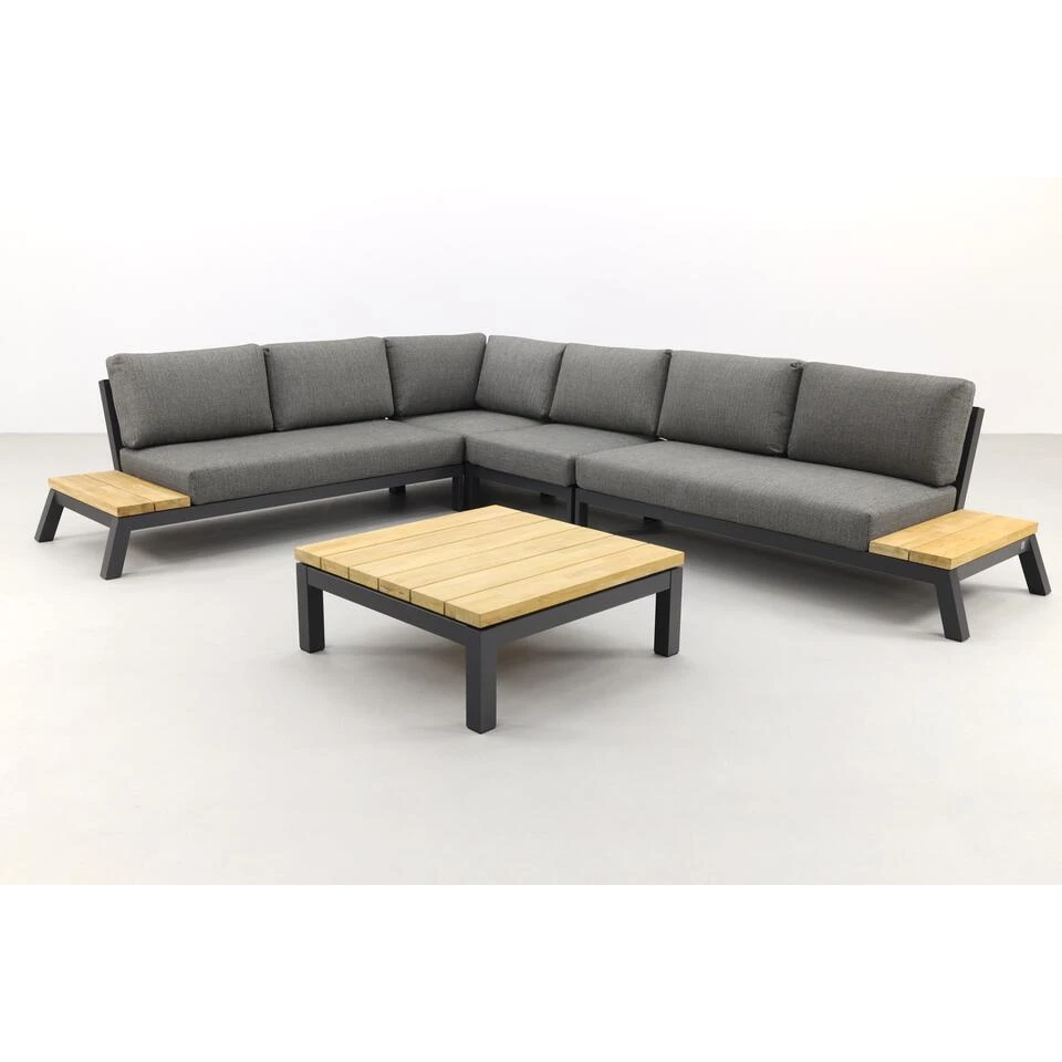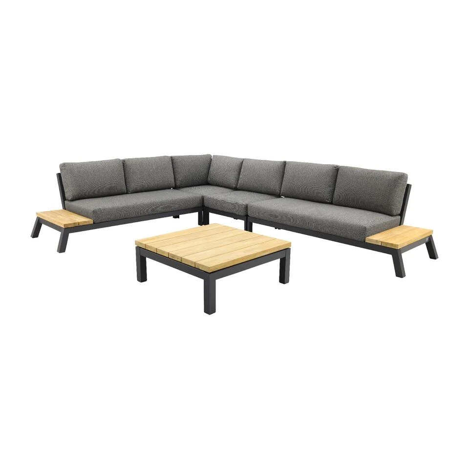 Deze eyecatcher is ontworpen uit hoogwaardige materialen. Het stevige frame is gemaakt van aluminium welke behandeld is met een poedercoating. Deze coating zorgt ervoor dat het frame kras- en stootvast is. Aluminium wordt veel gebruikt in de tuinmeubelindustrie en is dan ook perfect geschikt voor buitengebruik. Het materiaal kan niet verroesten, gaat jarenlang mee en heeft weinig onderhoud nodig. Daarnaast is het licht in gewicht zodat je de elementen eenvoudig kunt verplaatsen mocht dit nodig zijn. De massieve houten latten op de zijpanelen en de loungetafel zijn gemaakt van teakhout. Deze houtsoort is perfect geschikt voor buiten en zal na verloop van tijd vergrijzen. Ook kunnen er barstjes en haarscheurtjes ontstaan die het hout nog meer charme geven. Om vlekken te voorkomen kun je de teak tafel ook behandelen met een teak shield. Dit onderhoudsmiddel zorgt er tevens voor dat het teak water- en vuilafstotend is.Â