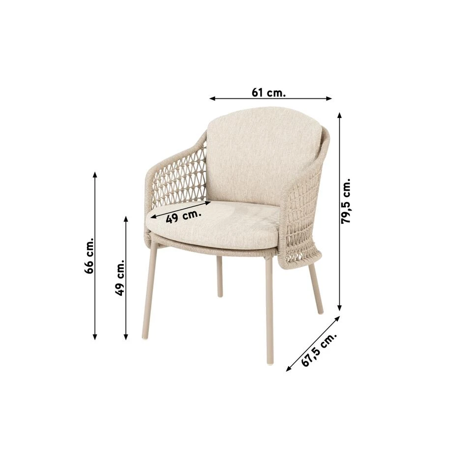 Deze prachtige Puccini tuinstoel van 4 Seasons Outdoor laat veel creativiteit zien. De latte kleur van deze stoelen zorgt voor een heel unieke uitstraling. Het RVS frame van deze stoel heeft een matte coating in deze kleur gekregen. Deze coating zorgt voor optimale weerbestendigheid zodat er nauwelijks tot geen onderhoud nodig is. Het rope heeft dezelfde kleur, zodat het een mooi geheel vormt samen. De ronde draden die gebruikt worden zijn voorzien van een kunststof kern. Het omhulsel van het touw wordt gemaakt van een weerbestendige stof, het voelt zacht aan en is waterafstotend, Uv-bestendig en kleurvast. Zo weet je zeker dat jij jarenlang kunt genieten van jouw Puccini tuinstoel! De kussen hebben een hoes van Olefin, een kleurvaste stof die Uv-bestendig is en waterafstotend. De kussens kunnen dus gewoon tegen een regenbuitje. Mochten ze vies zijn geworden, kan je ze makkelijk wassen op 30 graden middels de rits in de hoes.