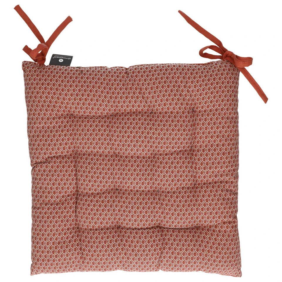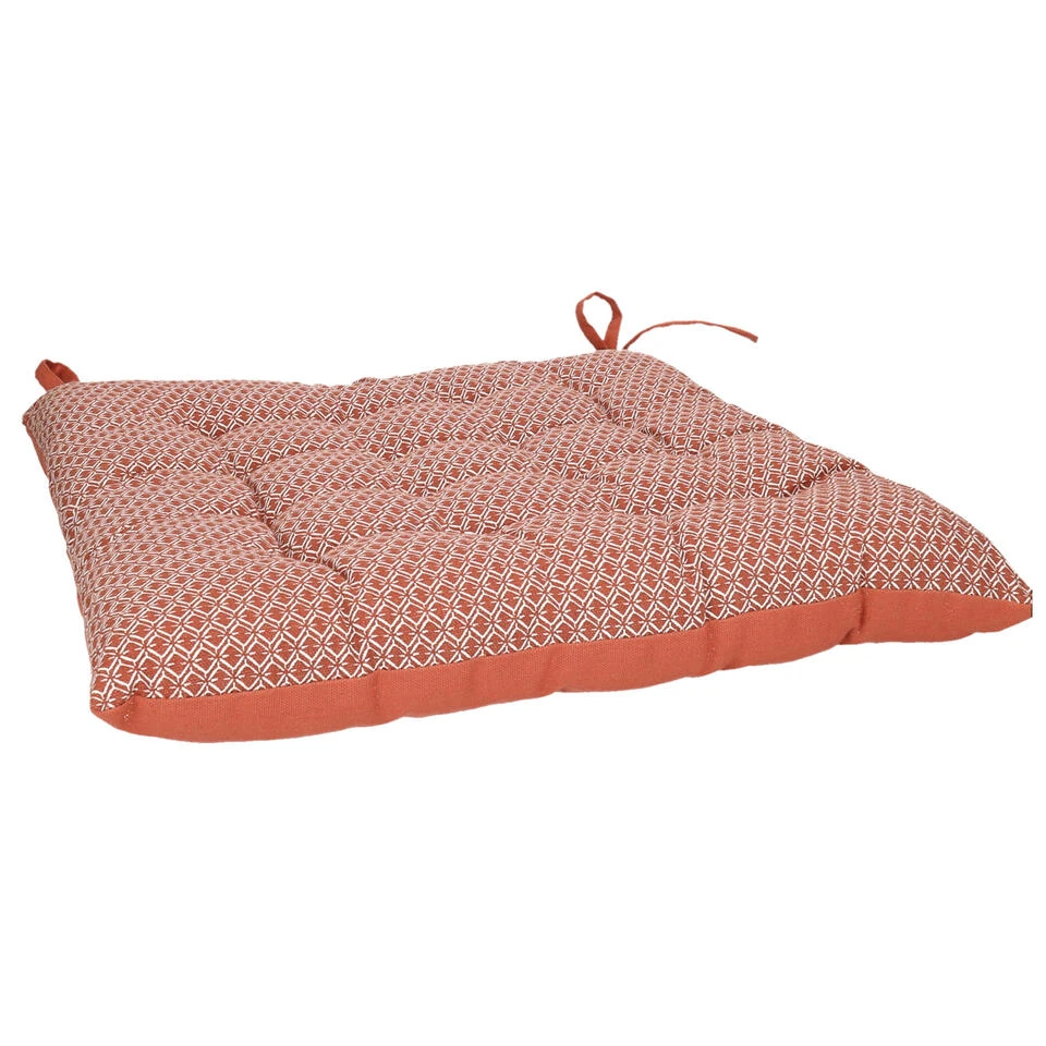 Atmosphera tuinstoelkussen wicker geschikt voor binnen en buiten gebruik. Kleur: terra met eenvoudig patroon. Afmeting: 38 x 38 x 7 cm Materiaal: 100% katoen. Niet wasbaar, afnemen met vochtige doek. Gewicht: 590 gram. Buiten/binnen kussens voor de stoelen van uw tuinstel of keukentafel. Diverse mooie luxe kleuren voor een topprijs. Met twee vastzet koordjes.