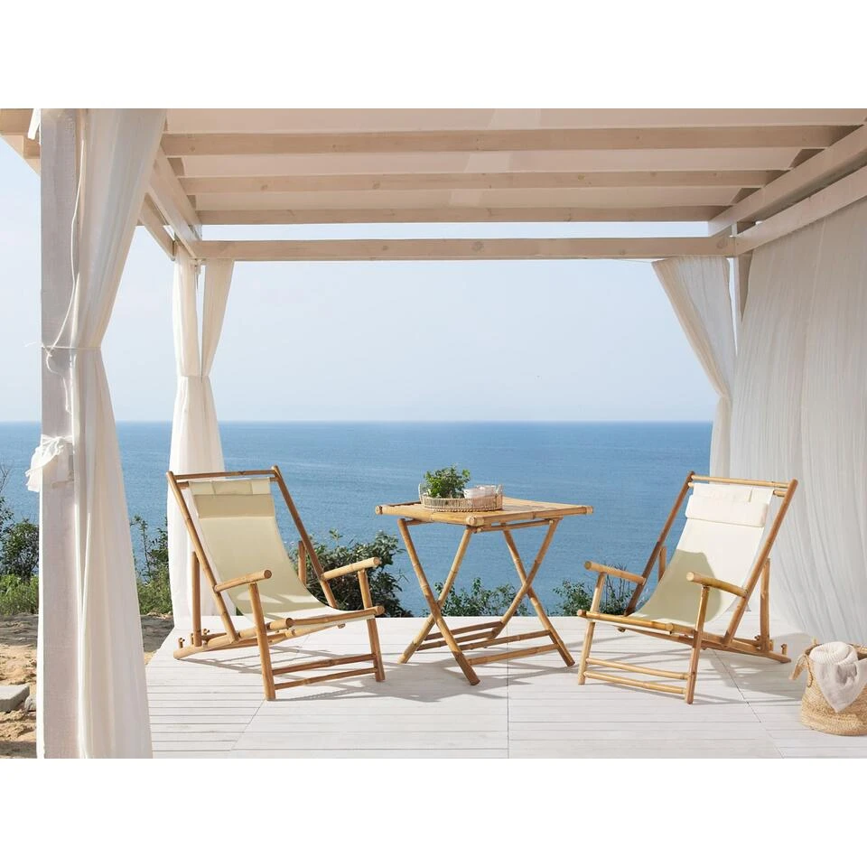 Opklapbare ligstoelen en bijzettafelset. Dit tweezits balkonset geeft jouw buitenruimte een hoop functionaliteit en stijl. Het is een ideale plek om van het mooie weer te genieten. Met zijn bamboehout in natuurlijke tinten past het perfect bij een tuin of balkon in een boho of natuurlijke stijl. Zowel de ligstoelen als de bijzettafel kunnen worden opgeklapt en kunnen gemakkelijk worden vervoerd en opgeborgen. De ligstoelen zijn voorzien van een polyester doek en een kussen. Ook de rugleuning kan in drie standen worden versteld.