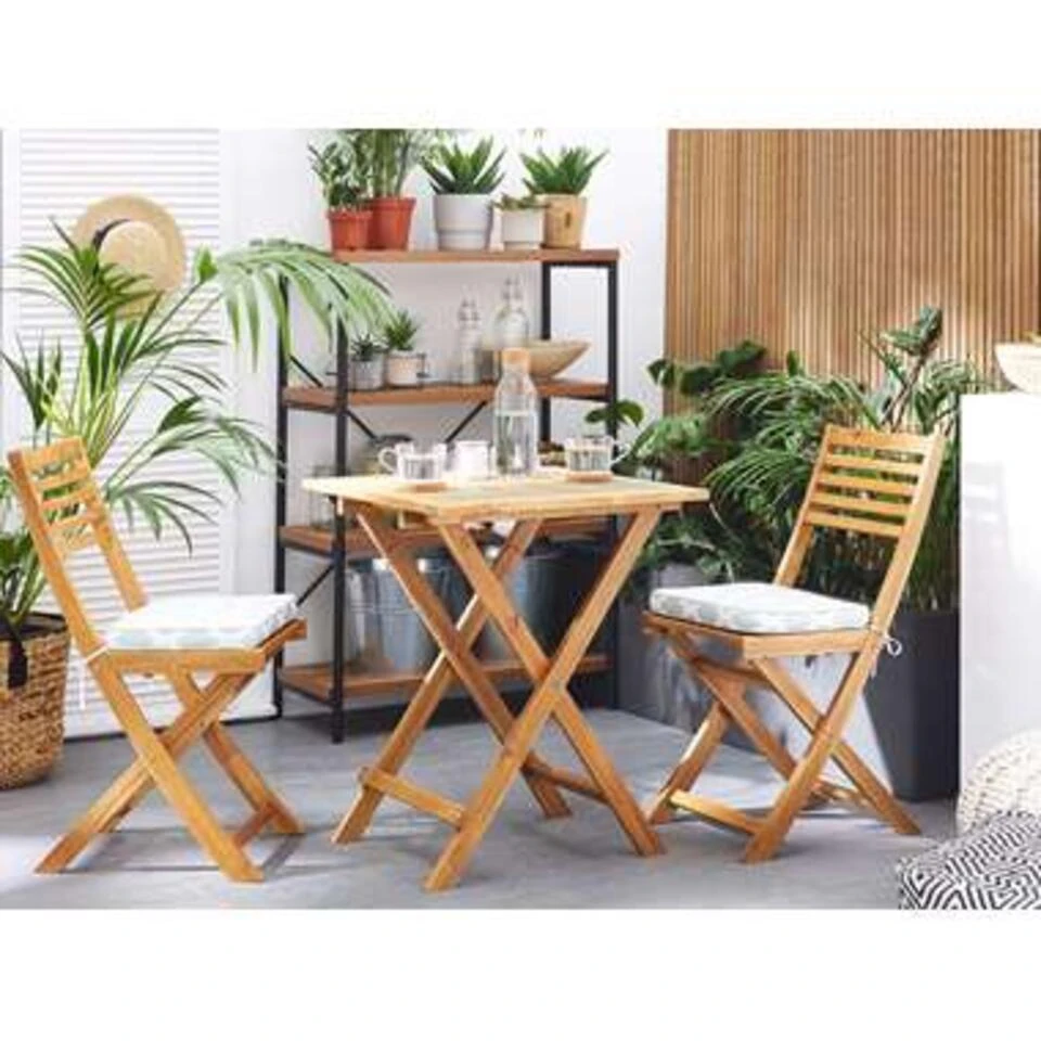 Romantische balkonset met mintgroene kussens. Een charmante bistroset is een prachtige toevoeging aan een tuin in nautische of landelijke stijl, vervaardigd uit massief acaciahout. De opvouwbare set is eenvoudig op te zetten en biedt moeiteloze opslag tijdens het laagseizoen. De bistroset is zonder meer een uitstekend tuinmeubelstuk, waarmee je jarenlang de heerlijkste ervaringen zult beleven. De stoelen worden geleverd met bijpassende kussens, een zalige plek om te ontspannen tijdens zonnige middagen.