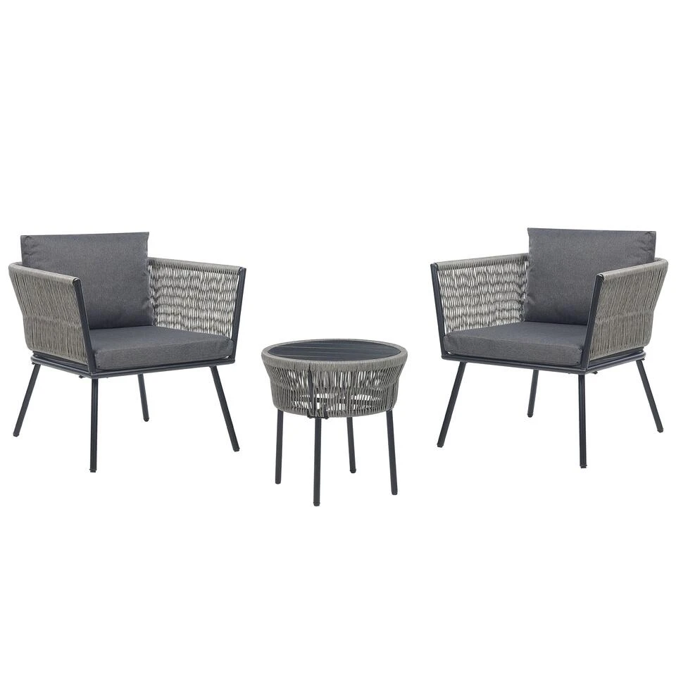 Robuust tweezits terrasset met kussens. Geniet van mooie momenten terwijl je in deze comfortabele tuinstoelen zit. De stoelen worden ondersteund door een stalen frame en zijn daarmee zowel stabiel als duurzaam. De afneembare kussens zijn niet alleen comfortabel maar ook UV-bestendig en door de ritssluiting is schoonmaken geen probleem. De set wordt aangevuld met een salontafel, een praktisch en stijlvol meubelstuk.