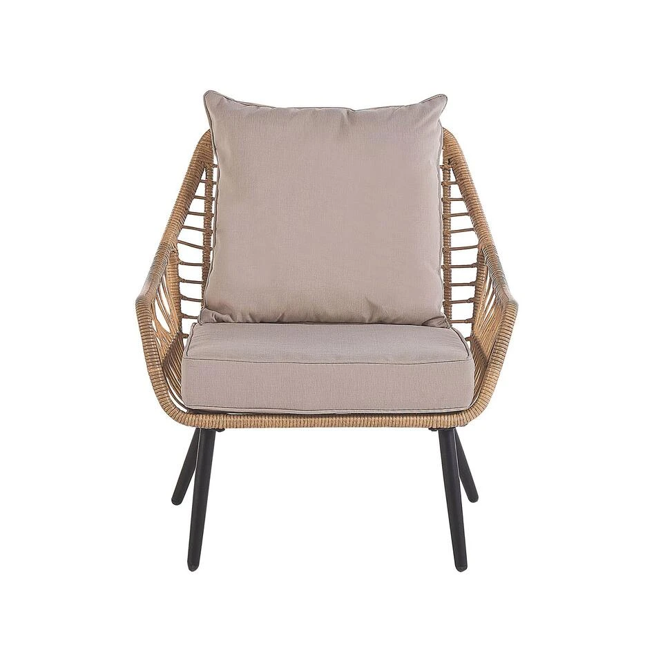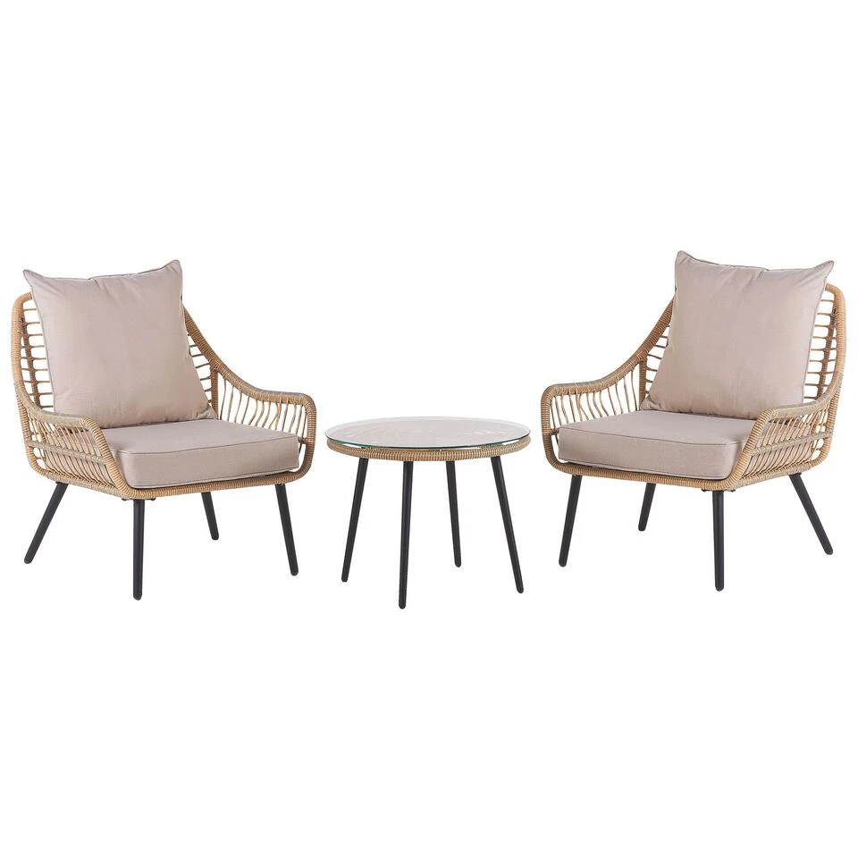 Balkonset met dubbelzijdige kussens. Deze compacte balkonset tovert je balkon en terras om tot een heerlijke plek waar je in alle rust met je vrienden kunt ontspannen en een koffiepauze kunt nemen. Dankzij de bijpassende dikke stoffering in beige zitten je gasten aan het einde van een gezellige avond nog steeds heerlijk comfortabel. Het glazen tafelblad, het stalen frame en kunststof rotan maken het meubel resistent en robuust, zodat het ook buiten gebruikt kan worden.