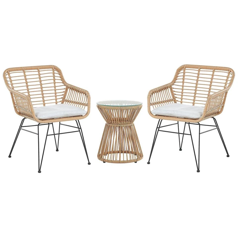 Gezellig, driedelig balkonset van van wicker. Deze zonnige tuinset met slanke vormen, een delicaat ontwerp en een luchtige look is precies wat je zoekt voor een afgelegen plek in de tuin of op het balkon. De 3-delige set bestaat uit twee comfortabele rieten tuinstoelen met prachtig gebogen armleuningen en een bijzettafeltje met een ronde glazen bovenkant. Comfortabel gewatteerde zitkussens en het elegante zwarte metalen frame maken het zomerse ontwerp compleet.