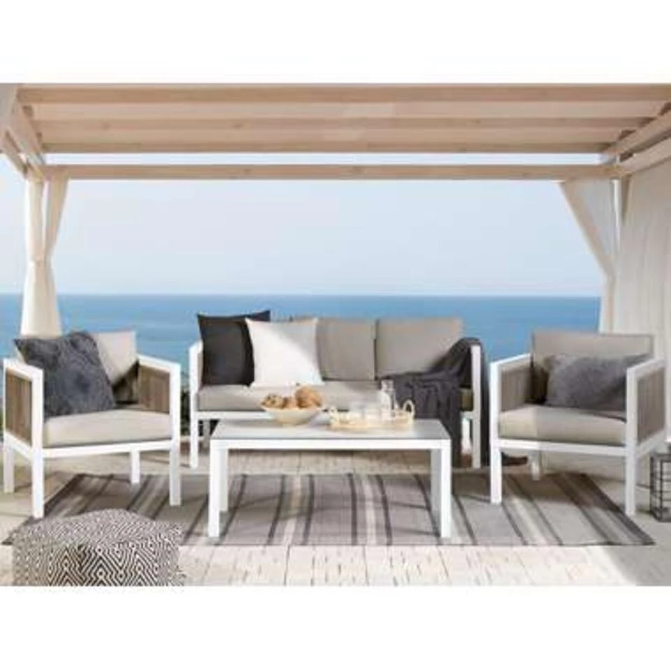 Outdoor bank met twee zetels inclusief tafel en kussens. Met deze moderne hoekbank geef je je buitenruimte een make-over. Het loungeset heeft een salontafel met een gemakkelijk schoon te vegen glazen blad. De sterke aluminium constructie zorgt ervoor dat het meubel er jarenlang goed uit blijft zien. De geweven rugleuning geeft het set een mediterrane flair. De witte afwerking past goed bij veel buitenstijlen en stelt je in staat om een persoonlijk tintje te geven, zoals decoratieve kussens of plaids.
