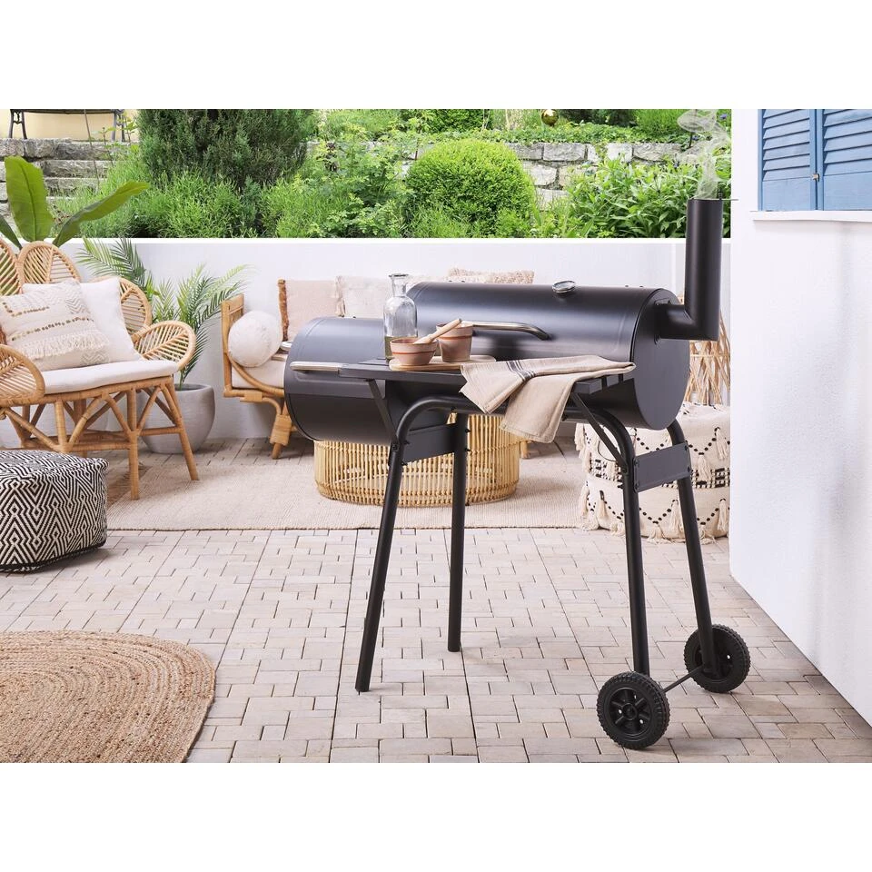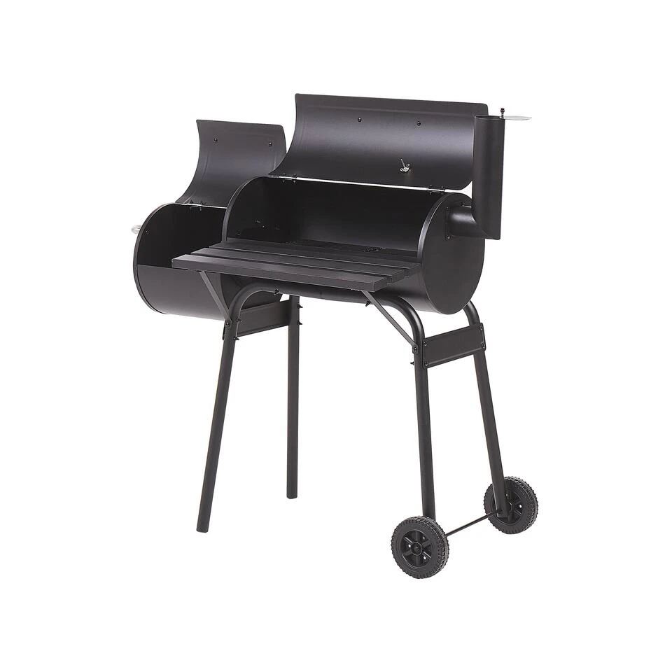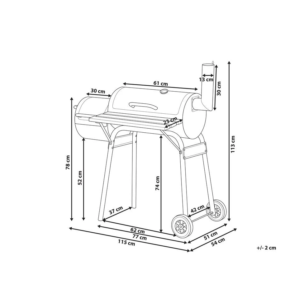 Verplaatsbare houtskoolgrill met offset-roker. Til je BBQ-ervaring naar een hoger niveau met deze geweldige grill. Het wordt geleverd met een brede kookkamer uitgerust met een stalen rooster, perfect voor het koken van vlees, groenten of vis. Met de thermometer op het deksel, een zijschot en een schoorsteen kun je de warmte regelen. Aan de voorkant zit ook een plank waar je al je accessoires in kwijt kunt. Daarnaast is de grill voorzien van een rookkamer aan de zijkant, zodat je tegelijkertijd kunt grillen en roken. Met de twee wielen verplaats je hem gemakkelijk.