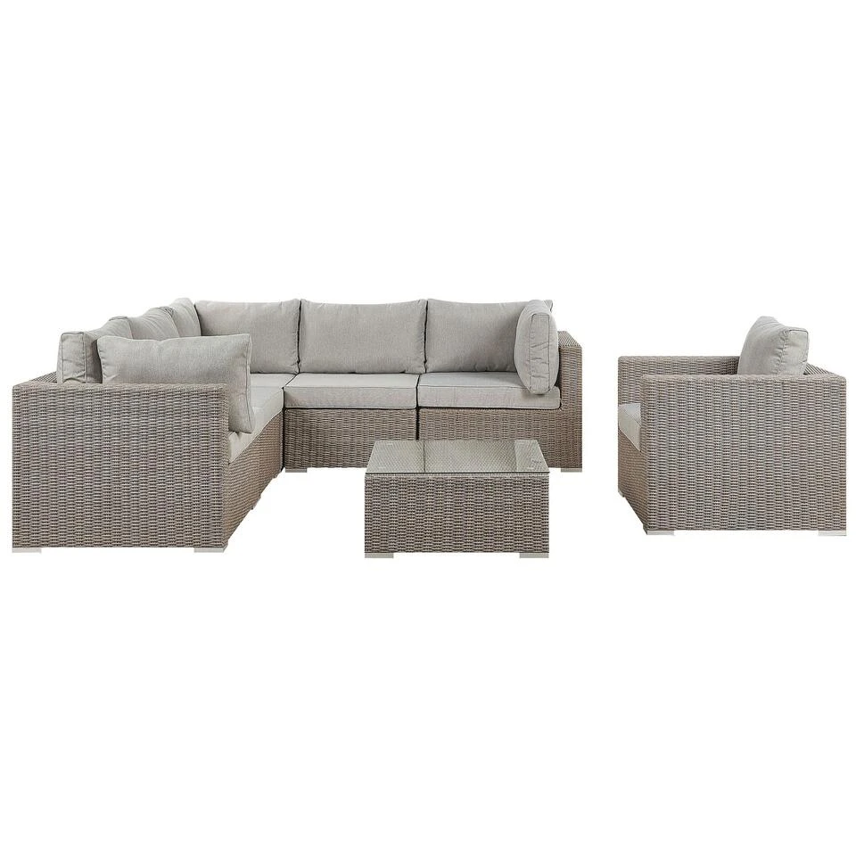 Gezellige, moderne tuinset van polyrotan. Deze prachtige sofaset met klassiek design biedt comfortabele zitplaatsen voor maximaal 6 personen. De set is gemaakt van weerbestendig en UV-bestendig harsrotan en is milieuvriendelijk en robuust. Dankzij de modulaire functie kan de 5-zitshoek wanneer het u uitkomt in 5 afzonderlijke delen worden opgedeeld. De set bevat pluche en zacht aanvoelende kussens voor alle stoelen en rugleuningen. De afneembare hoezen zijn gemaakt van polyester, onderhoudsvriendelijke stof die vochtbestendig en vlekbestendig is. Perfect voor het serveren van drankjes of snacks, de tafel is bedekt met een blad van gehard glas.