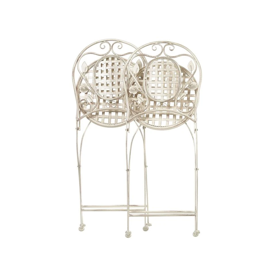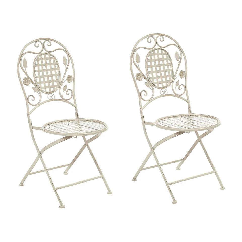 Set van 2 inklapbare balkonstoelen in cremewit. Voeg een vleugje Provençaalse stijl toe aan je balkon of tuin met deze elegante set van twee stoelen. De tuinstoelen zijn gemaakt van gepoedercoat ijzer en hebben een verweerd effect en een opengewerkt ontwerp met bloemenornamenten. Combineer stoelen met een bijpassende tafel om de perfecte plek te creëren voor ontbijt of lunch in elke buitenomgeving. De stoelen zijn inklapbaar, dus je kunt ze ook buiten het seizoen makkelijk opbergen.