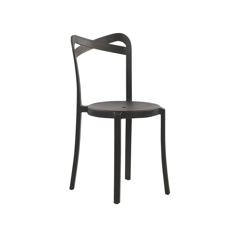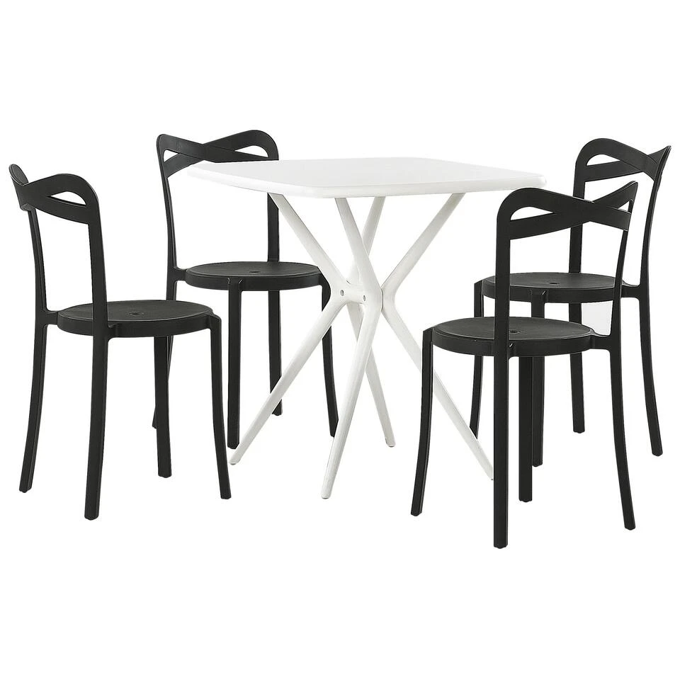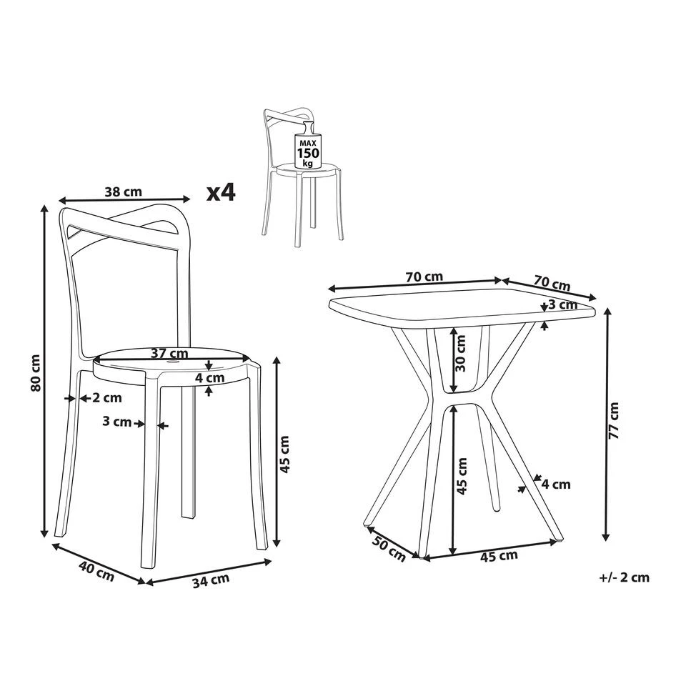 Terras eettafel en stoelen. Haal het beste uit het zomerweer en geniet van de zon in je tuin of op een balkon met deze tafel en stoelen set. Alle elementen zijn gemaakt van duurzaam plastic, dus ze zijn gemakkelijk te verplaatsen en zullen niet worden beschadigd door een lentebui. Het meubilair past in elke moderne binnen- of buitenruimte dankzij het eenvoudige, veelzijdige ontwerp. De stoelen kunnen worden gestapeld voor eenvoudige opslag en hebben een middengaatje dat voorkomt dat water zich ophoopt.