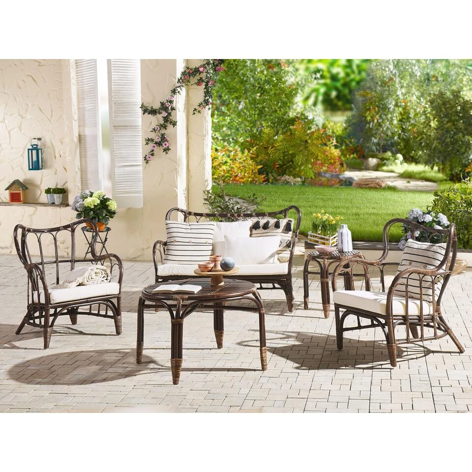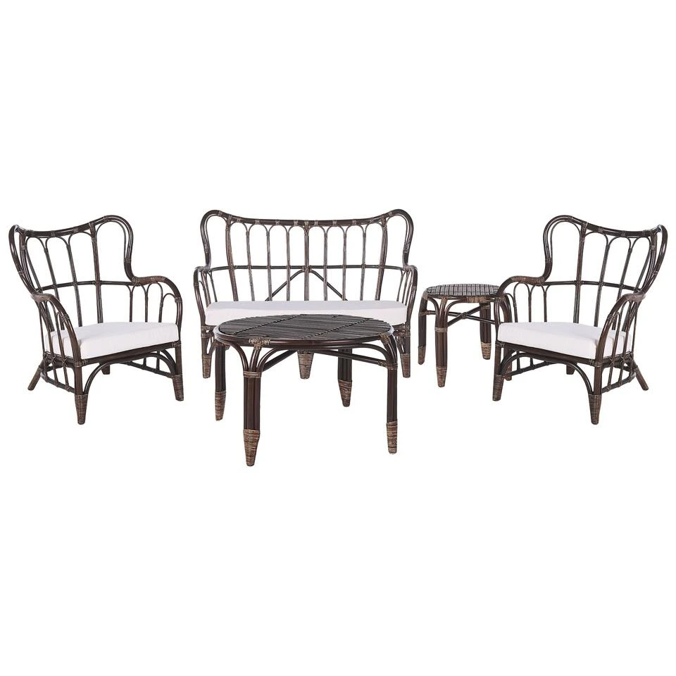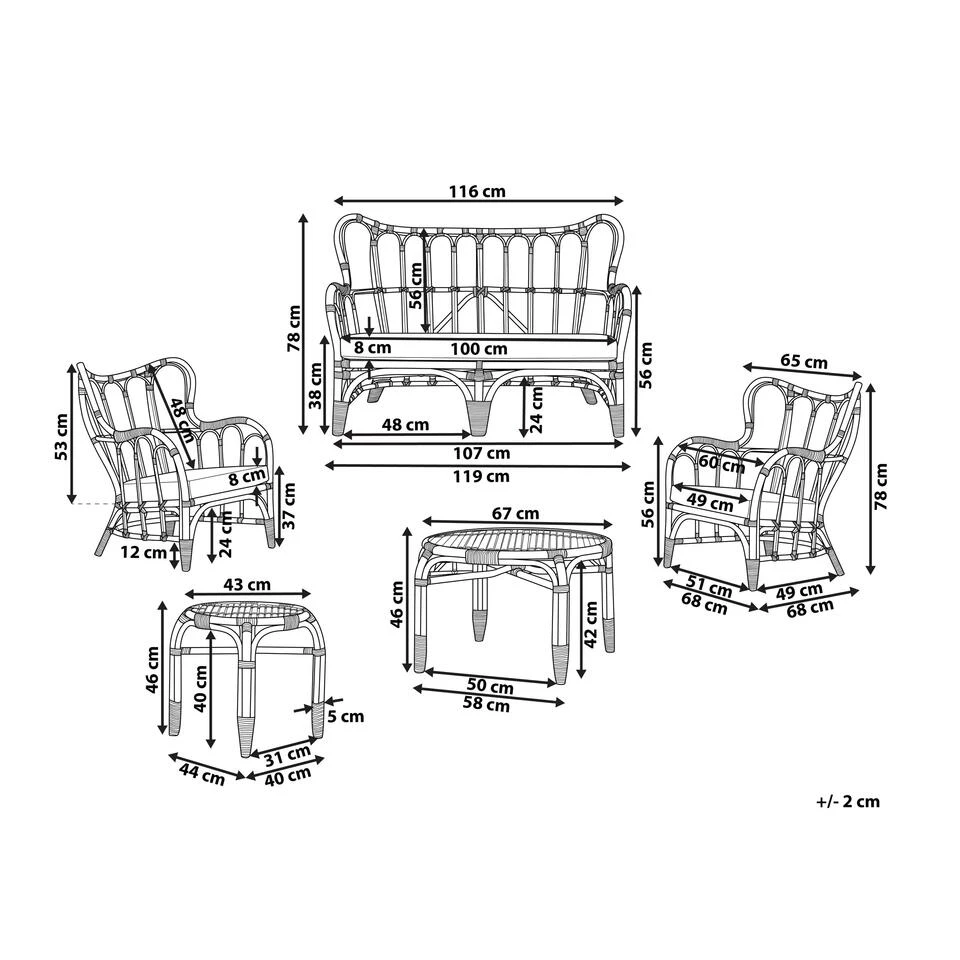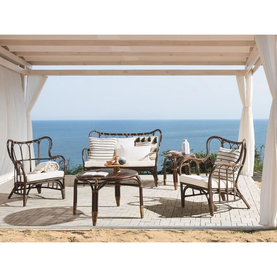 Tuinloungeset met 2 tafels. Deze charmante tuinset is alles wat je nodig heeft om jouw tuin zowel functioneel als esthetisch compleet te maken. Het is volledig gemaakt van natuurlijk rotan waardoor de fauteuils en bank perfect bij alle planten en bloemen passen. De zacht gevoerde zitkussens zorgen voor het hoogste zitcomfort en zorgen ervoor dat je talloze uren loungend kan doorbrengen. Vergeet de snacks en drankjes niet, die je veilig op het kleine bijzettafeltje of op de bredere salontafel kan plaatsen.