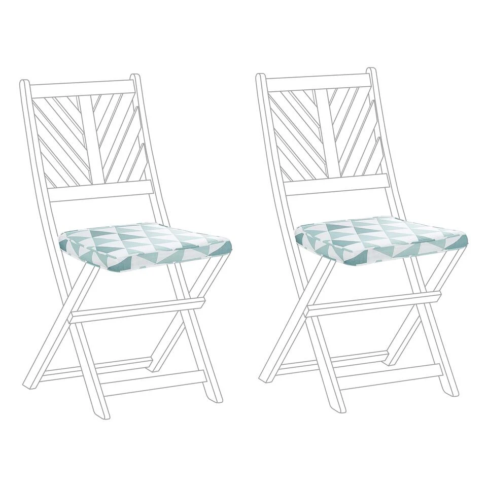 Set gewatteerde buitenkussens. Geen tuinmeubel is compleet zonder een zitkussen dat voor extra comfort zorgt. Deze set met een geometrisch driehoekspatroon voor een tuinstoel wordt geleverd met een dikke vulling voor comfortabel zitten. Met de banden kun je de onderdelen eenvoudig aan het frame van de stoelen bevestigen. Het opvallende patroon in een subtiele lichtblauwe kleur brengt zomerse charme in elke buitenruimte.