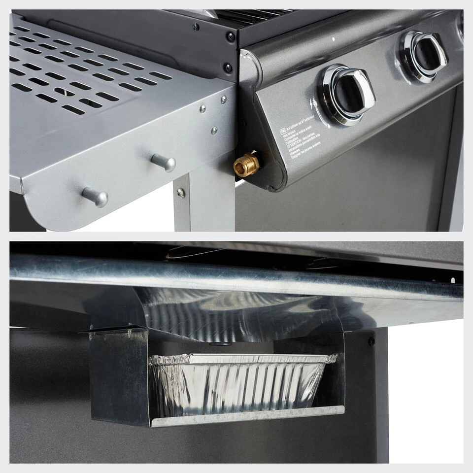 Een super 3-pits gasbarbecue in roestvrij staal met motorkap, zijplanken, wielen en piëzo-ontsteking. Een concentraat van goede ideeën voor perfecte maaltijden.