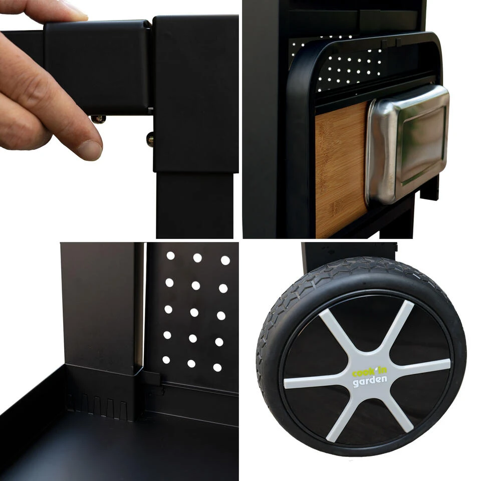Kies een compleet tuinaccessoire om u te helpen uw zomerse maaltijden te bereiden. Deze tuintrolley is gemakkelijk te verplaatsen van de keuken naar uw terras dankzij de twee wielen, zodat u alles mee kunt nemen wat u nodig hebt voor het grillen op de plancha. Het heeft twee geperforeerde platen, waarvan er een als credenza kan worden gebruikt om de kookplaat tegen de wind te beschermen. Dit betekent dat u beschikt over een werkblad, een laag plateau en een zijplank, die kan worden ingeklapt om ruimte te besparen wanneer u de trolley opbergt. Deze plancha trolley is voorzien van accessoires zoals een snijplank, kruidenbakje, haken, enz.