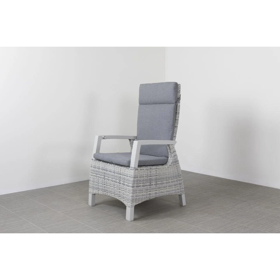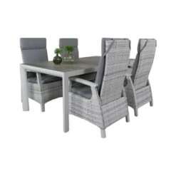 Verstelbaar tuinset met een unieke uitstraling. De tuinset bestaat uit 4 comfortabele standenstoelen en een unieke tuintafel. De verstelbare stoel heeft een aluminium frame en is verstelbaar door middel van een gasveer. Om dit frame is het weerbestendige kunststof wicker gevlochten. De stoel wordt geleverd met een comfortabel kussen. Aan de tuintafel kunnen 4 personen plaats nemen.
