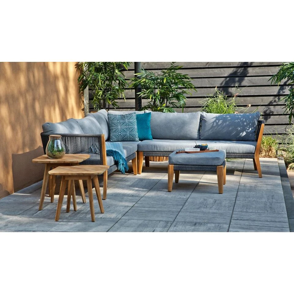 Rope is de laatste jaren een echte trend in de tuinmeubelbranche. Misschien dat bij jou gelijk de vraag opkomt, wat is rope? Rope is een soort touw met weerbestendige eigenschappen en wordt steeds vaker toegepast bij loungesets, tuinstoelen etc. De kleur van het rope materiaal staat mooi in contrast met de kleur van het teakhout en geeft dan ook een stijlvolle uitstraling. Het frame van de Exotan San Remo loungeset is gemaakt van aluminium. Voordeel hiervan is dat het licht van gewicht is en niet kan verroesten. De poten van zowel de loungeset als de hocker zijn gemaakt van teakhout. Teakhout is een langzaam groeiende houtsoort met een hoge vezeldichtheid. Dit zorgt ervoor dat het hout erg stevig is en niet snel splintert. Na verloop van tijd zal het teakhout gaan vergrijzen en kunnen er haarscheurtjes en barstjes ontstaan. Dit doet geen afbreuk aan de kwaliteit van de San Remo loungeset. Het zorgt zelfs voor een nog natuurlijkere uitstraling. Mocht je de voorkeur hebben om de originele kleur van het teakhout te behouden, dan adviseren wij om het teakhout te behandelen met een teakprotector.