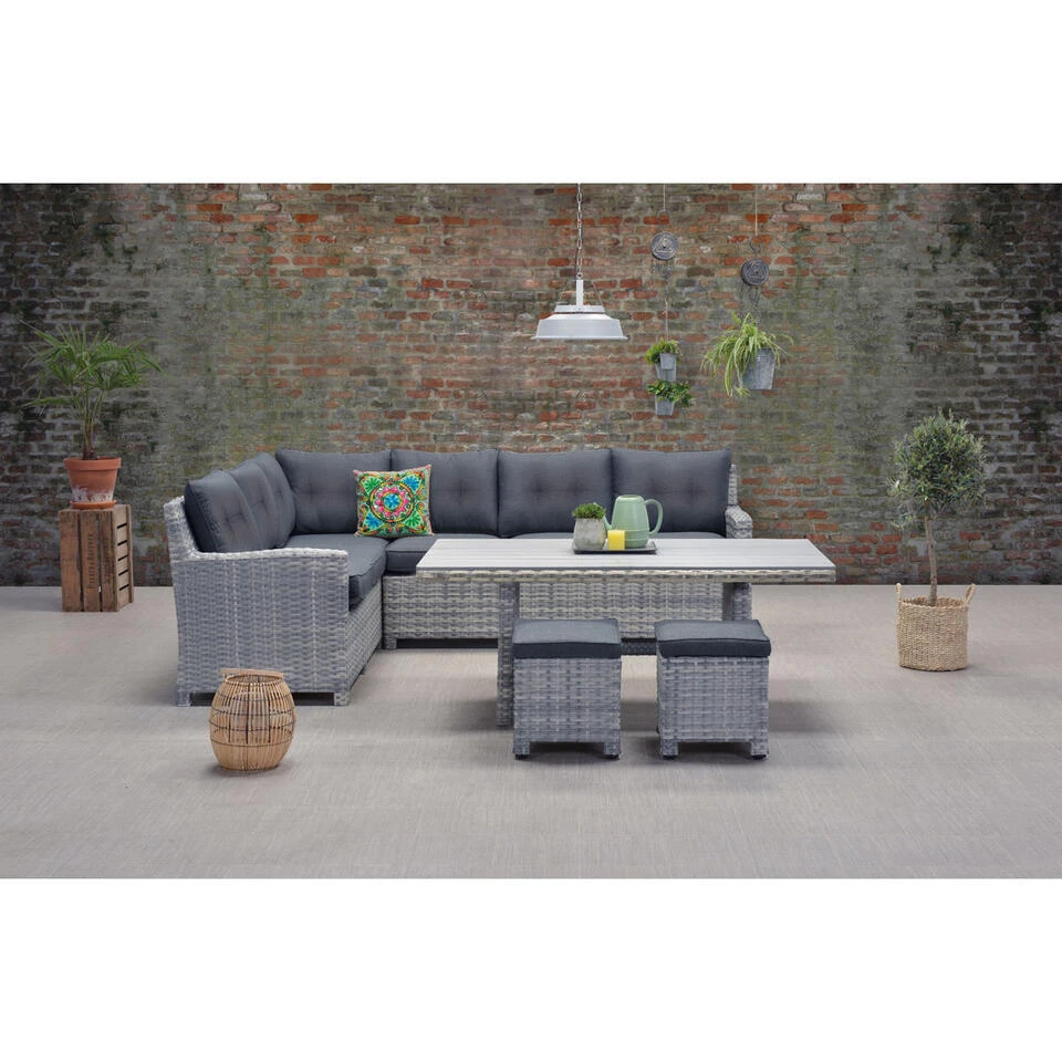 Twijfel je tussen een loungeset of een tuintafel met stoelen? Met de Alaska lounge dining set 6-delig hoef je niet meer te kiezen tussen comfortabel dineren of heerlijk loungen. Deze mooie en ruime lounge dining set van kwaliteitsmerk Garden Impressions heeft het allebei!