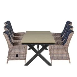 Deze tuinset geeft een fijne sfeer aan jouw tuin. De Stone tuintafel is een mooie robuuste tuintafel met een x-frame. De Marbella dining tuinstoel heeft een mooie uitstraling en is erg comfortabel. De Marbella dining stoel is vervaardigd uit een onderhoudsvrij aluminium frame en weerbestendig half rond wicker kunststof vlechtwerkdraad. Het draad is vrij dikte wat zorgt voor een robuuste uitstraling. Wicker is een stevig en duurzaam kunststof, waardoor je jarenlang kunt genieten van de Marbella tuinstoel. Deze tuinstoel wordt bovendien geleverd inclusief een polyester zit- en rugkussen. Het zitkussen is voorzien van een rits, waardoor het hoesje gemakkelijk met de hand gewassen kan worden. Het rugkussen is voorzien van extra stiksels om een extra mooie chique vorm te geven aan het kussen. Na gebruik kunnen de kussens opgeborgen worden in de schuur of in een kussenbox. De Stone tafel is vervaardigd uit een onderhoudsvrij aluminium frame gecombineerd met Vironwood in vintage teak look. Het tafelblad is gemaakt van vironwood, dit is een houtsubstituut. Het is synthetisch en bevat geen hout. Het grote voordeel ten opzichte van hout, is dat Vironwood niet ‘werkt’. Dit betekent dat er na verloop van tijd geen scheurtjes of barsten in zullen ontstaan, wat je bij echt teakhout natuurlijk wel vaak hebt. Vironwood is gemakkelijk schoon te maken met een sopje van groene zeep. Ook is het aan te raden om een schuine helling in de hoes te creëren zodat het water er vanaf kan lopen. Afmeting stoel: 74,5 x 64 x 95 cm en de tuintafel heeft een afmeting van 240 x100 cm.