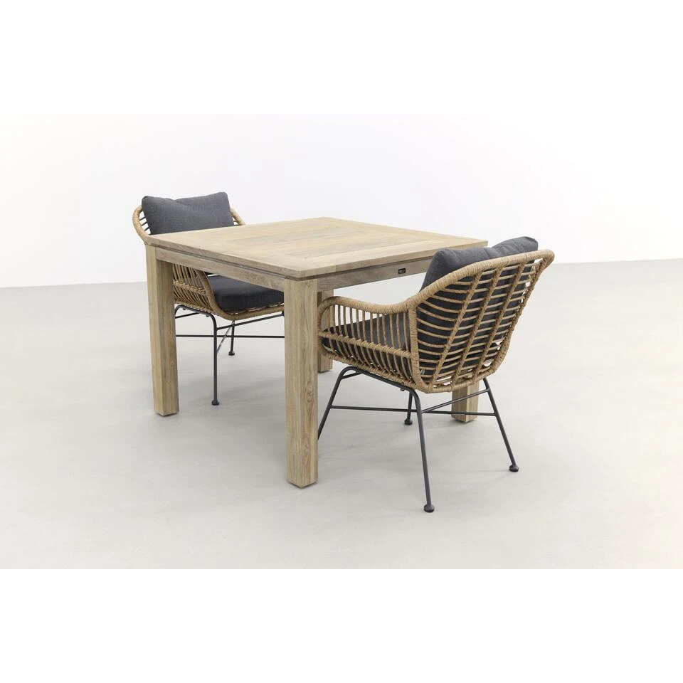 Wil jij graag een kleine tuinset met een retro design in jouw tuin hebben staan? Dan is deze Margriet/Rome tuinset een ideale keus voor jou! De Rome tuintafel is met een afmeting van 100×100 cm. lekker compact waardoor hij in bijna elke tuin of balkon past. De stoere uitstraling van deze tafel komt voornamelijk door het massieve teakhout. Het hout is behandeld met een grey wash waardoor het een unieke look krijgt. De Margriet tuinstoelen van Garden Impressions zorgen dat je helemaal terug gaat in de tijd. Het rotan van vroeger is vervangen door wicker. Dit geeft dezelfde retro look, alleen gaat het veel langer mee! Deze tuinset is direct online te bestellen.