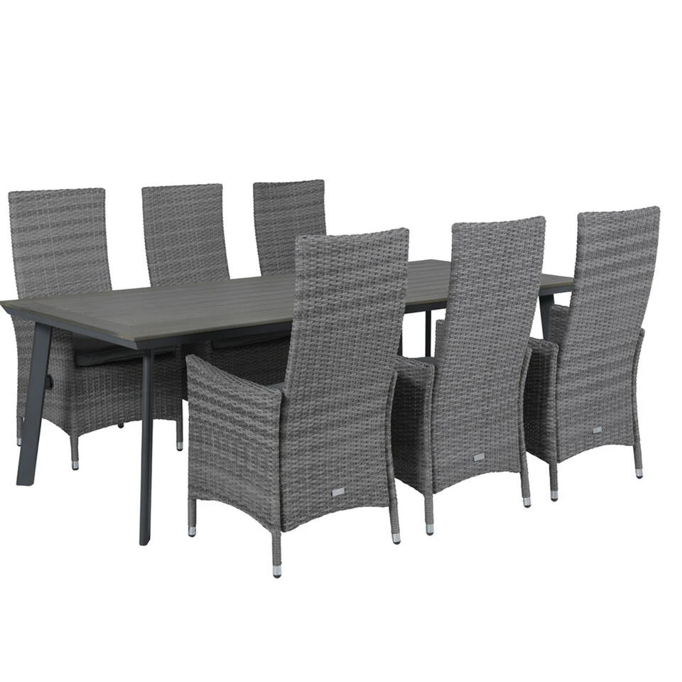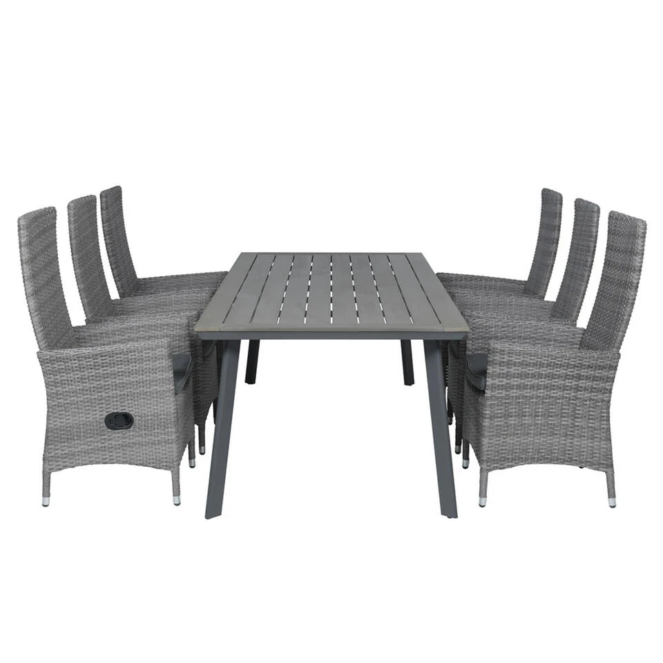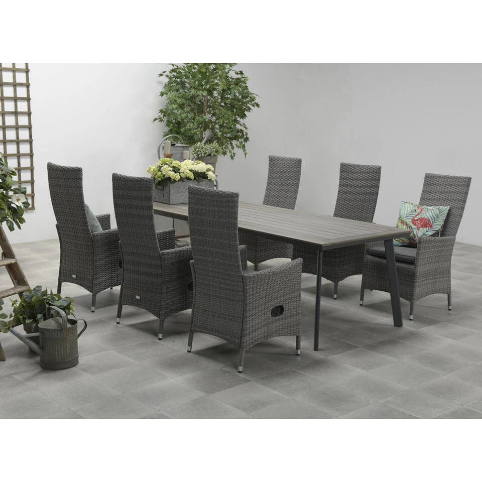De tuinstoel heeft een diepte van 59 cm, een breedte van 62 cm en de tuinstoel is 110 cm hoog. De tuintafel heeft een afmeting van 230 cm bij 100 cm en is 72 cm hoog. De hoogte tot de onderkant van het tafelblad is 67,5cm. De aluminium tuintafel heeft een carbon black kleur. Het polywood tafelblad van deze mooie tuintafel heeft een grijze kleur.