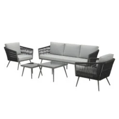De Odessa loungeset is gemaakt van een aluminium frame met een mat grijze coating. Het voordeel van aluminium is dat het een zeer onderhoudsvriendelijk materiaal is. Daarnaast is aluminium vrij licht en kan de loungeset gemakkelijk verplaatst worden naar een andere plek in de tuin. Om het aluminium frame zit hoogwaardig 6 mm dik kwaliteit touw voor een mooie uitstraling. Dit touw is te vergelijken met touw dat in de scheepsvaart gebruikt wordt. Het touw is voorzien van een rubberen kern binnenin met daarin meerdere polyester draden voor de stevigheid. Om de rubberen kern zit solution dyed polyester rope. Dit betekent dat het touw door en door gekleurd is en verkleurt veel minder snel.
