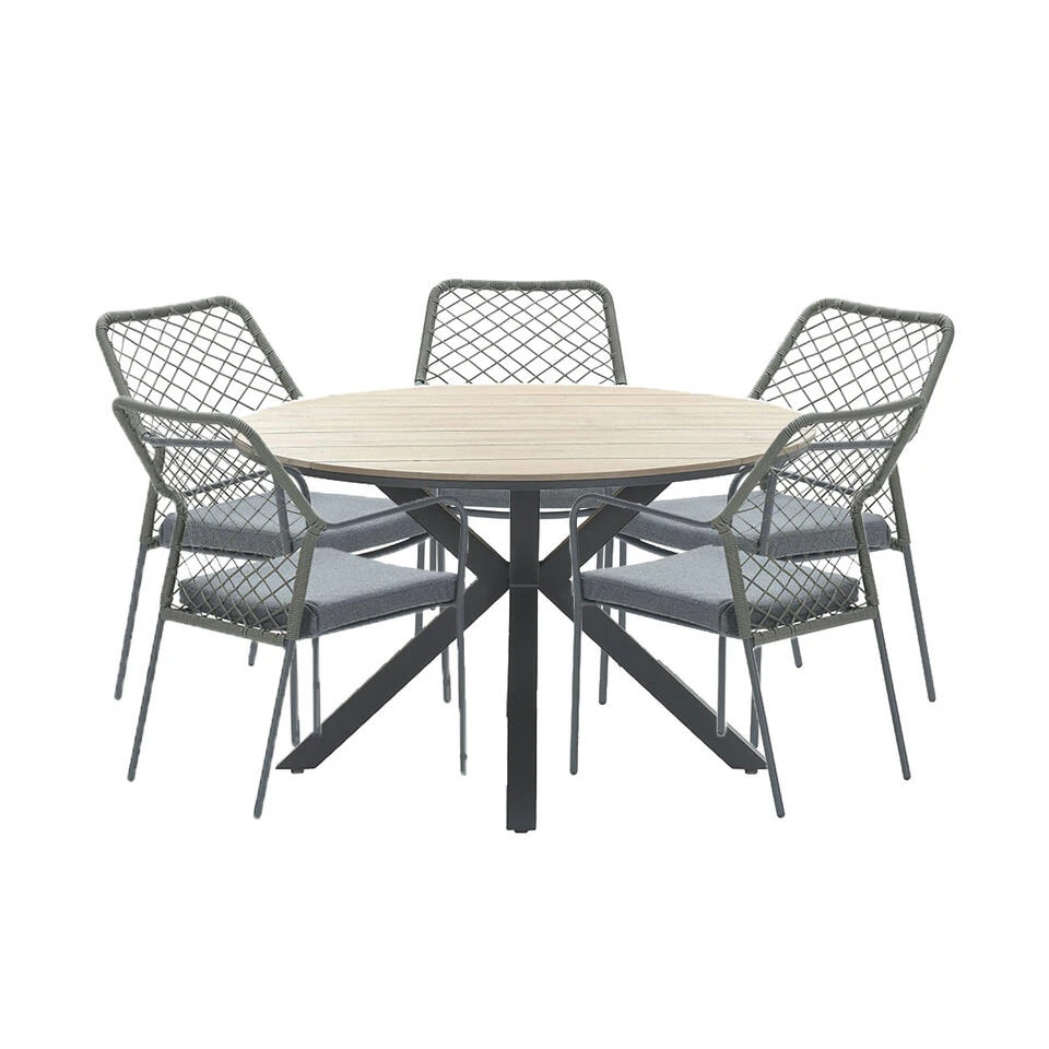De Ross – Tulli 6-delige tuinset heeft een ruime ronde tuintafel met vijf tuinstoelen. De tuinstoelen hebben een mooie afwerking van TPU draden. Dit geeft de stoel het uiterlijk of er touw is gebruikt. Bij de tuinstoelen worden zitkussens meegeleverd.