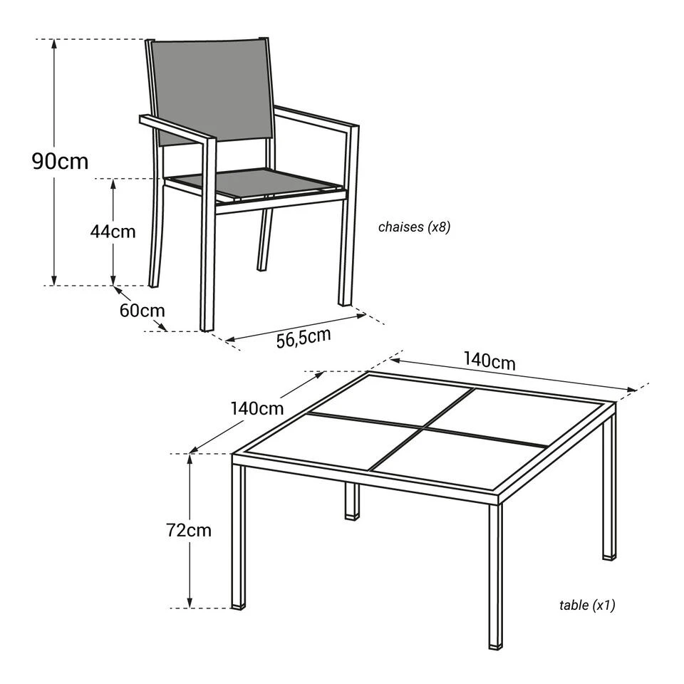 – Tafel: L 140 × B 140 × H 72cm