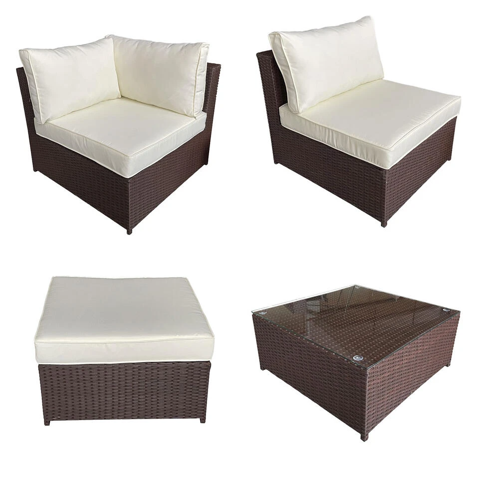 Deze tuinmeubelsets van geweven hars bestaan uit een hoekbank, een opklapbare fauteuil en een grote salontafel. Met ruimte voor veel gasten zijn deze 7-zits tuinmeubelen een gezellige en comfortabele ruimte. Deze tuinsets zijn verkrijgbaar in drie kleuren: zwart en grijs, bruin en ivoor of grijs.