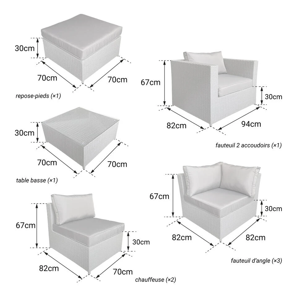– Fauteuils: L 70 × B 82 × H 67cm