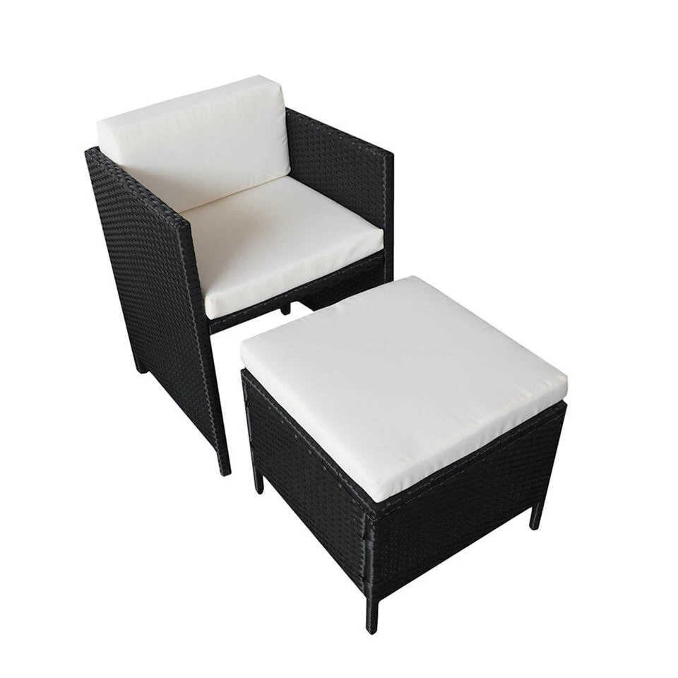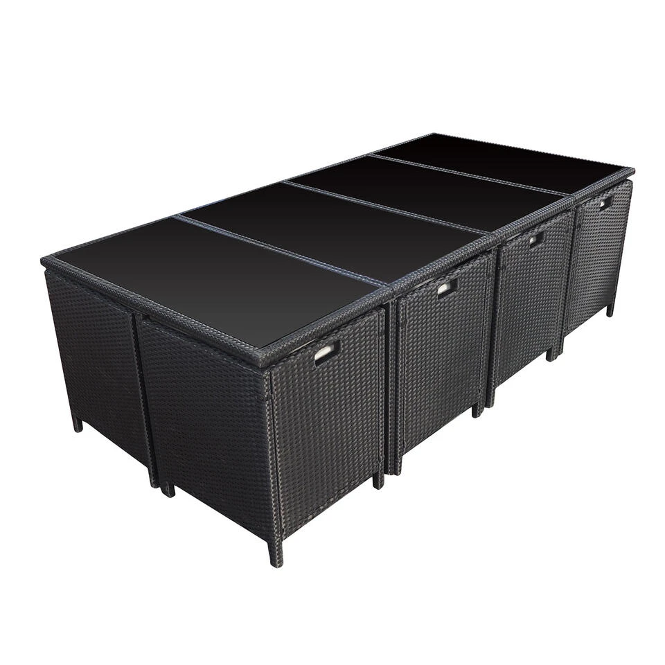 De SANTORIN tuinmeubelen van geweven hars zijn perfect om tijd door te brengen met familie en vrienden. De comfortabele ivoorkleurige kussens passen perfect bij het zwarte hars. Met 8 fauteuils en 4 krukjes kun je tot 12 mensen rond de tafel laten zitten. Met zijn moderne lijnen en tijdloze kleuren zal deze lounge van geweven hars er geweldig uitzien in elke buitensetting.