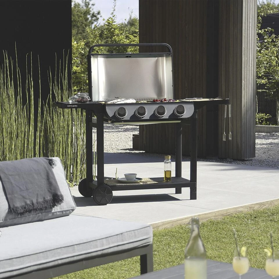 De Cook’in Garden FLAVO 76 SC gasbarbecue op wagen is het ideale toestel voor barbecueliefhebbers die willen genieten van de zomer met lekkere gegrilde gerechten. U bereidt gemakkelijk smakelijke gerechten voor een grote tafel dankzij het ruime kookoppervlak met geëmailleerde gietijzeren roosters en plaat. Het toestel is snel en eenvoudig te installeren dankzij het slimme clipsysteem. Het heeft 3 uitneembare schappen voor uw kookgerei en ingrediënten, en twee wielen voor een gemakkelijke verplaatsing. Met zijn 4 branders met een totaal vermogen van 10 KW garandeert deze gasbarbecue een efficiënte bereiding van uw voedsel, vlees, vis of groenten.