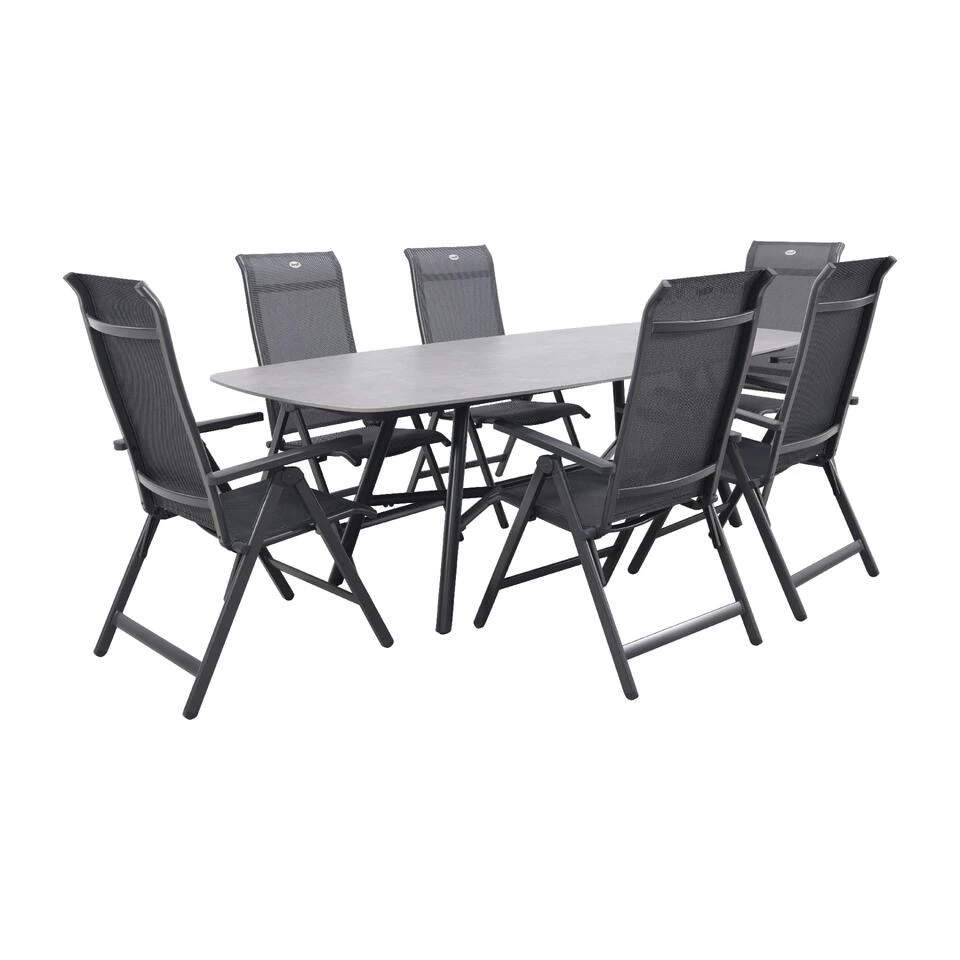Haal de zomer in huis met deze prachtige Milaan/Benevento tuinset van Hartman! De Milaan standenstoelen van Hartman zijn niet alleen stijlvol en comfortabel, maar ook nog eens opvouwbaar en verstelbaar. Het unieke ontwerp van de gebogen randen aan de zitting en rugleuning zorgt voor een elegante uitstraling. De half ovale Benevento tuintafel met keramisch tafelblad maakt deze set compleet en geeft een trendy Scandinavische touch aan je tuin. Geniet met vrienden en familie van gezellige diners in de buitenlucht aan deze prachtige tafel, geschikt voor 6 personen. Bestel nu en geniet de hele zomer van deze fantastische set!Â