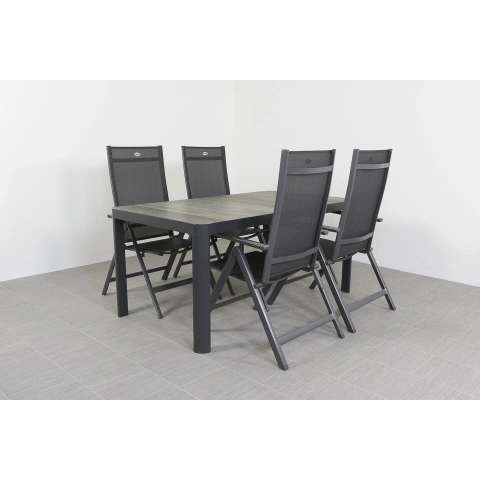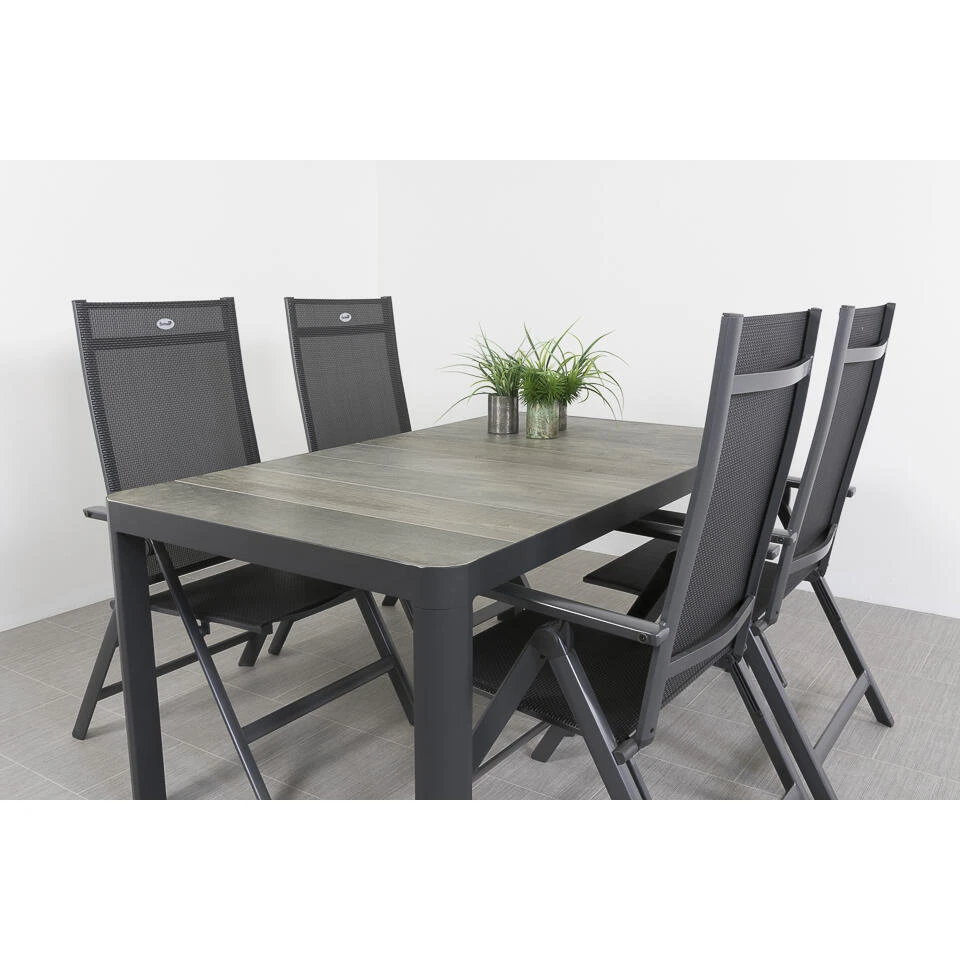 De Queens tuintafel heeft net als de tuinstoel een aluminium frame. Dit materiaal is licht in gewicht, super stevig en heeft weinig onderhoud nodig. Het frame is afgewerkt met een antracietkleurige poedercoating welke kras- en stootvast is. Het tafelblad is gemaakt van keramiek. Dit is een harde steensoort en dus perfect geschikt als tafelblad. Het keramiek heeft een houtlook waardoor de tafel een stoere uitstraling krijgt. Met zijn afmetingen van 160 x 90 cm. biedt de Queens tuintafel plaats aan 4 personen.