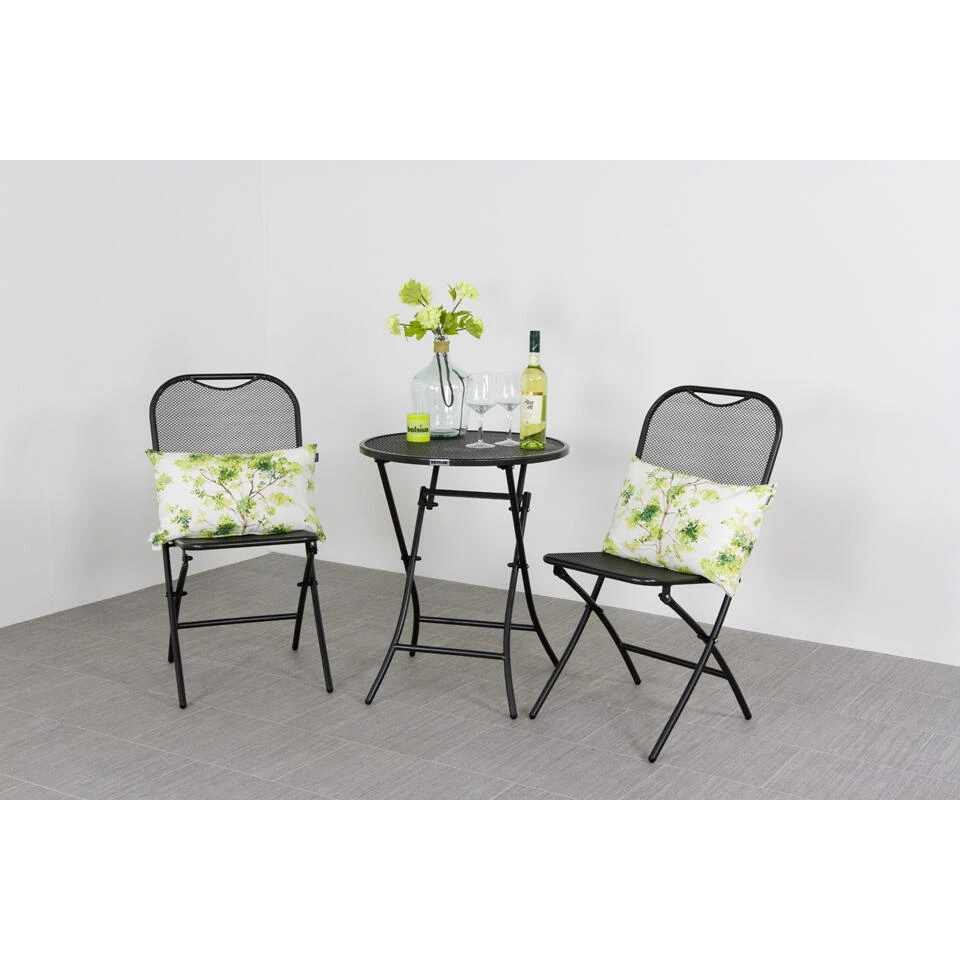 De Calvia balkonset van het bekende tuinmeubelmerk bestaat uit twee inklapbare tuinstoelen en een inklapbare tuintafel. De stoelen hebben een ergonomisch zitcomfort zodat de balkon tuinstoel erg lekker zit. De Calvia tuinstoel en de tafel zijn inklapbaar en dus erg compact op te bergen. De tafel heeft een doorsnede van 60 cm. Dit zorgt ervoor dat de tuinset perfect geschikt is voor op uw balkon.