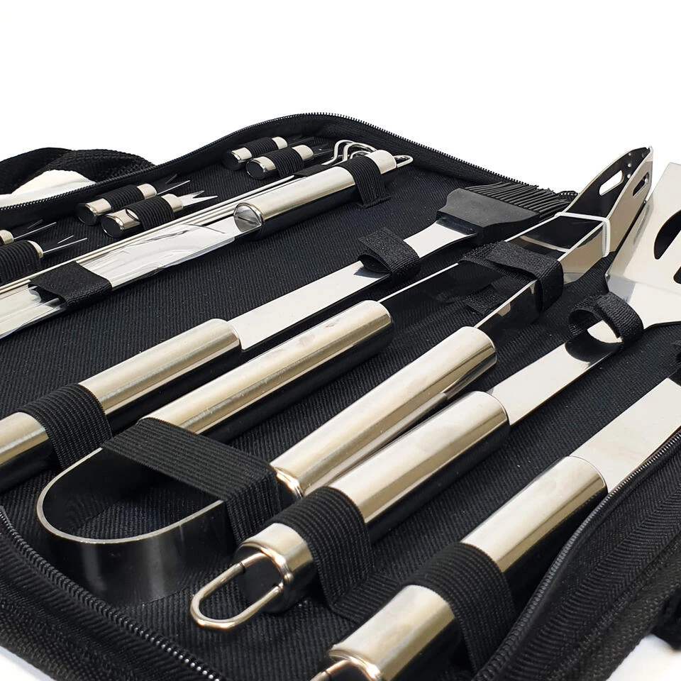 De compacte stoffen tas meet 38.5 bij 12 bij 5 centimeter en de hele kit weegt minder dan een kilo. Daardoor is deze set dus erg draagbaar en ideaal voor op vakantie. De uitgebreide set bevat echter wel alle gereedschappen en benodigdheden voor de BBQ die je je kan indenken. De tas bevat onder andere een stalen spatel, een lange stalen vork, een scherp rvs mes, een stalen barbecuetang en een siliconen borstel. Ook vind je een aantal hittebestendige spiesjes en kleine vorken in de set om vlees en groenten aan te rijgen en mee te serveren.
