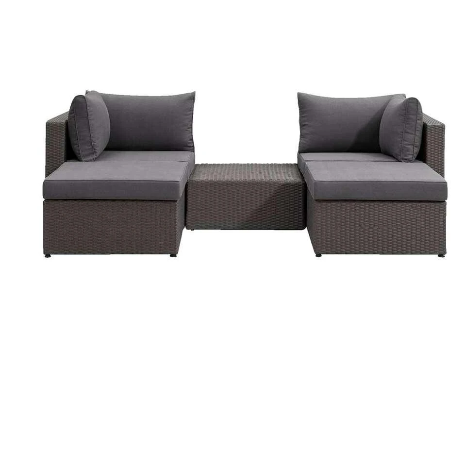 Modulaire loungeset Dordogne biedt ruimte om met 2Â personen heerlijk te relaxen. De gehele serie is gemaakt van hoogwaardig aluminium en kunststof met een wicker look. Voordeel van kunststof wicker is dat deze veel langer mee gaat dan gewoon wicker. Zo kan jij dus optimaal genieten van zowel de kwaliteit als zijn prachtige uitstraling. Deze tuinset wordt geleverd incl. donkergrijze Brest loungekussens, gemaakt van katoen/polyester. Dit is een zeer complete en luxe set die jou verzekerd van vele uren relaxen in de tuin. Laat de zon maar schijnen!