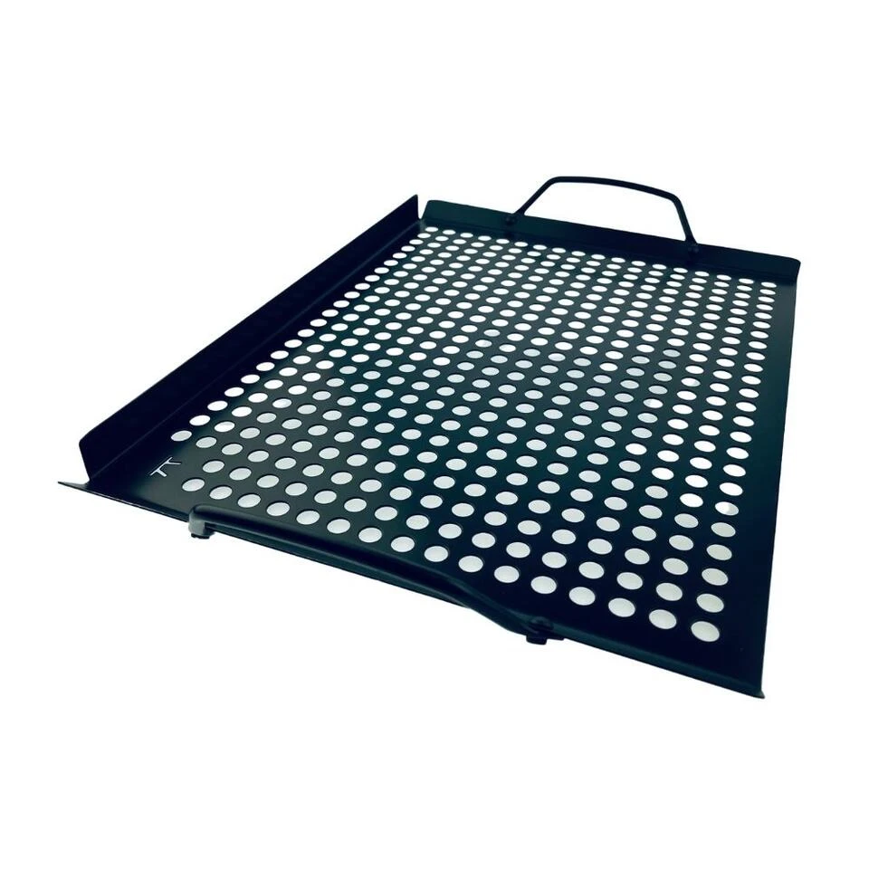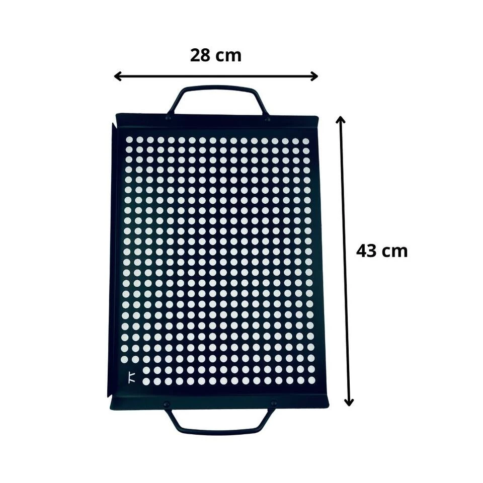 Met de grillplaat van Orange85 is vlees, groenten of fruit eenvoudig om te grillen. Je kunt de grillplaat op je barbecue leggen zodat het eten niet tussen het rooster door kan vallen. Ideaal bij bijvoorbeeld worsten of vis. De plaat is voorzien van een anti-aanbak laag waardoor het eten niet vast kan kleven. Hierdoor is hij ook weer eenvoudig schoon te maken. Tevens is hij gemaakt van RVS dus is hij geschikt voor de vaatwasser.