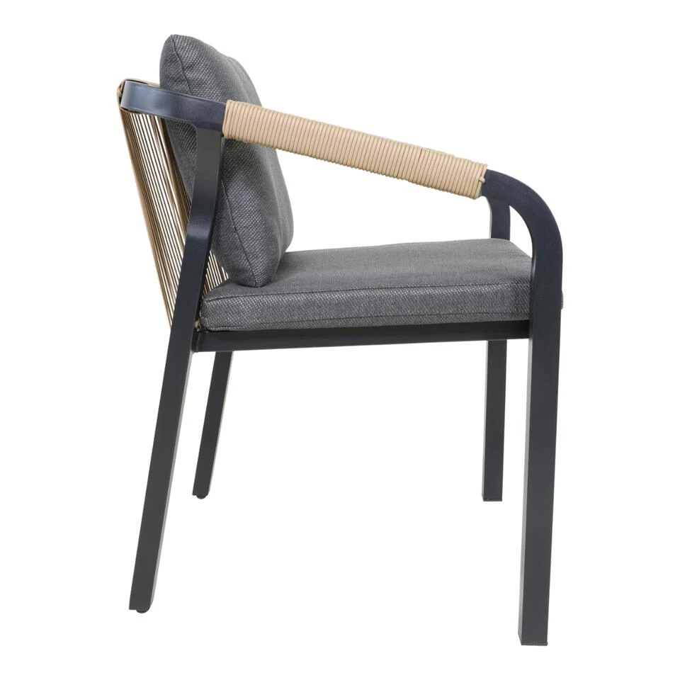 De Rimini terrasstoel in grijs is neutraal, chique en passend binnen iedere tuin. Rimini is afkomstig van het geliefde woonmerk Les. Deze tuinstoel heeft een afmeting van 58x60x75cm en is perfect geschikt voor iedereen die opzoek is naar een chique en comfortabele uitstraling. Het frame is gemaakt van aluminium in mat zwart. Om de leuningen zit TPU wicker met een gaaf touw motief. Rimini is voorzien van twee comfortabele kussens in het lichtgrijs voor extra zitcomfort. Zo kan er uren op deze terrasstoel worden nagetafeld op een mooie zomeravond. Rimini is ook verkrijgbaar al barkruk en bartafel. Combineer dit geheel voor eenheid binnen de tuin. Plaats Rimini onder uw veranda of op het terras en geniet van gezellige avonden met vrienden en familie.