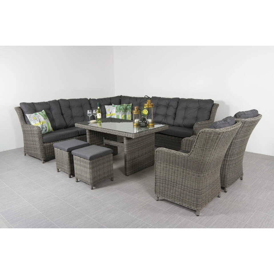 Richmond lounge dining set compleet met twee dining tuinstoelen. De set is uitgevoerd in de kleur Ash grey. Dit is een donker grijze kleur die goed combineert met de antraciet kleurige kussens. De Richmond lounge dining set brengt loungen en dineren samen in een set. De loungeset is perfect geschikt om heerlijk te loungen maar met de hoge loungetafel is het ook mogelijk om te dineren in de loungeset. De twee dining tuinstoel maken de set helemaal compleet. Het XL hoekelement zorgt voor een extra zitplaats in de hoekbank.