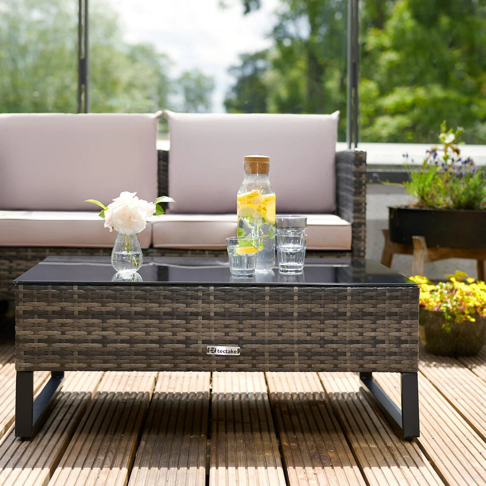 Creëer uw eigen ontspanningsruimte met de gezellige rotan lounge Ostuni van tectake. De dikke zit- en rugkussens nestelen zich zacht tegen het lichaam en kunnen na gebruik gemakkelijk worden opgeborgen in de grote opbergdoos. Het elegante hoogtepunt van het onderhoudsvriendelijke ensemble is de lage tafel met zijn stijlvolle blad van zwart veiligheidsglas. Het gepoedercoate stalen frame en het slijtvaste polyrattan weefsel zijn verantwoordelijk voor de extreme robuustheid en hoge veerkracht van de vierdelige meubelgroep – harmonie met een feel-good garantie: de chique rotan ligstoel Ostuni van tectake.