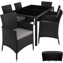 Deze wicker tuinset is heel veelzijdig en een echte blikvanger voor uw tuin, uw terras, wintertuin of woonkamer. Comfortabele stoelen en een elegante tafel nodigen uit om leuke uren met familie of vrienden door te brengen. De wicker set valt niet enkel door zijn elegante look in de smaak maar ook door zijn lange levensduur. Het tafeloppervlak met de 2 donkere glazen elementen oogt heel sierlijk en valt heel gemakkelijk te reinigen. De zeer comfortabele, beige zitkussens van polyester zijn qua kleur uitstekend op de set afgestemd en uitgerust met een ritssluiting aan de achterkant zodat de hoezen gemakkelijk gereinigd kan worden. Om de vullingen tegen het binnendringen van vocht te beschermen, is het oppervlak geïmpregneerd. Zo parelen vuil- en waterdruppels er gewoon af. Er wordt ook een beschermhoes meegeleverd.