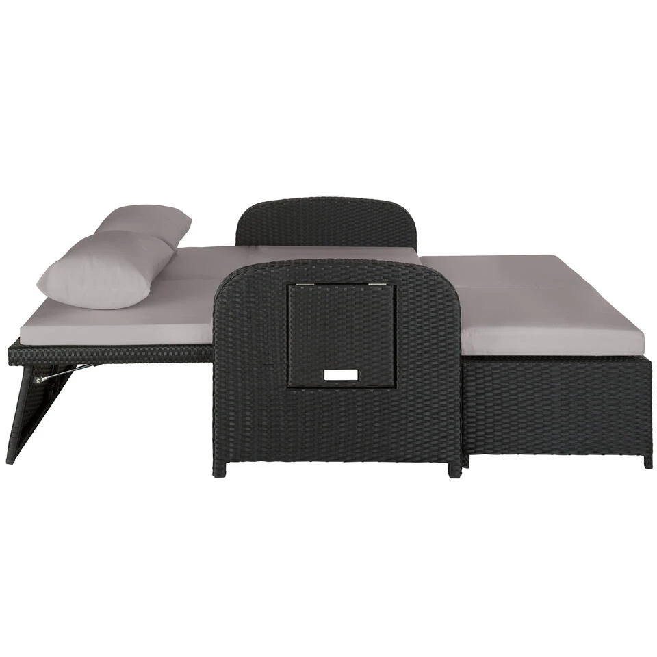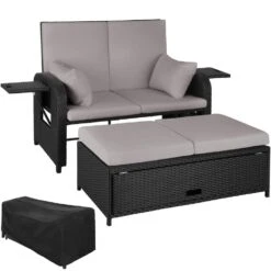 De multifunctionele ratan sofa van tectake met zijn extra zachte kussen en de in de hoogte verstelbare rugleuning biedt optimaal zit- en ligcomfort. Met enkele handbewegingen wordt de uitnodigende zitgelegenheid een uitnodigende ligstoel. Bijzondere clou: De beide zijdelingse, uitklapbare legvlakken. De compacte bank en de praktische kruk met opbergruimte voor de comfortabele en waterafstotende kussens worden klaar gemonteerd geleverd. Het hoogwaardige vlechtwerk van duurzaam polyratan en het stabiele frame van aluminium maken deze roestvrije ratan bank van tectake tot het perfecte outdoor garnituur.