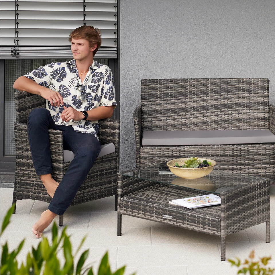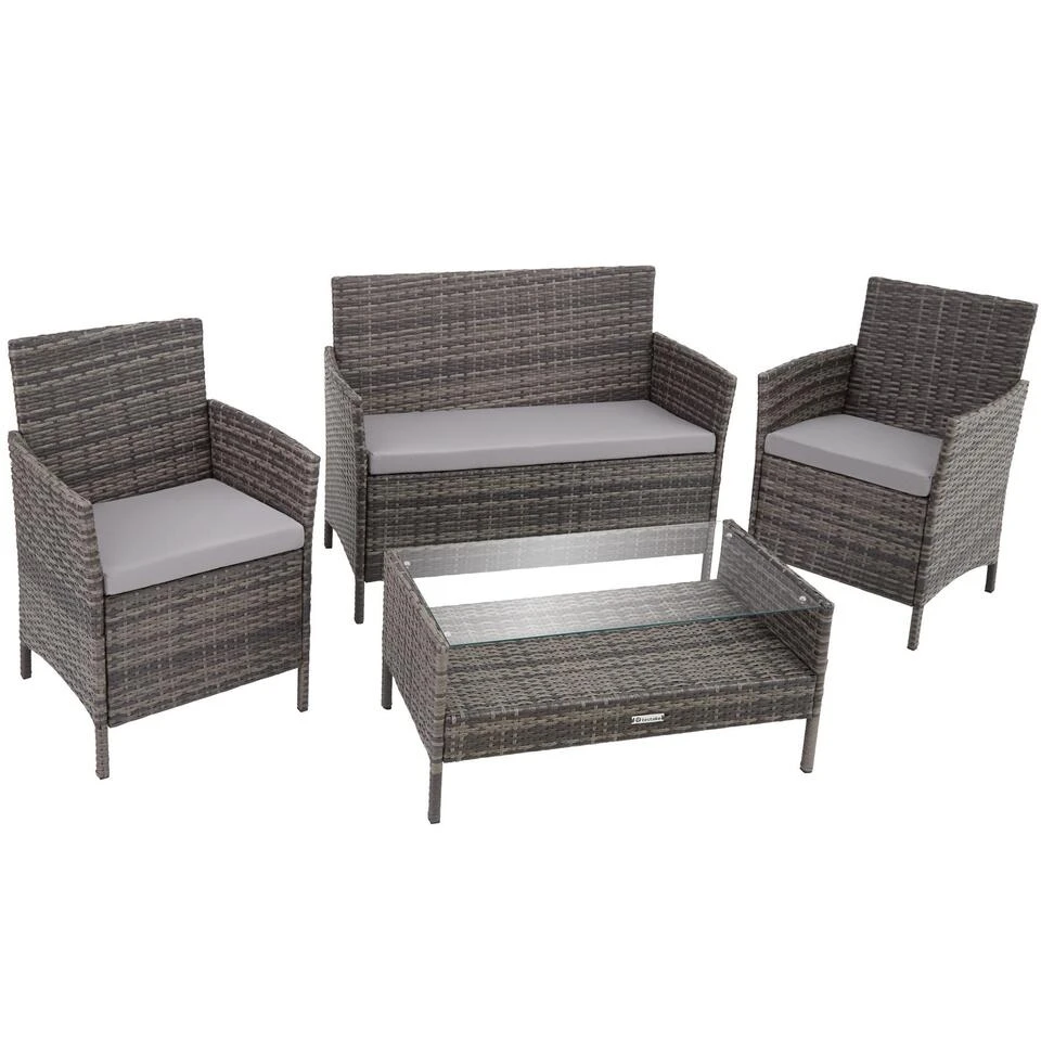 Chique, robuust en onderhoudsvriendelijk: de wicker tuinset van tectake combineert grote functionaliteit en hoog comfort. De twee stoelen en de zitbank met wicker weefsel van kunststof zijn ideaal geschikt voor gebruik in open lucht. De verwijderbare bekledingen zijn qua kleur perfect op het garnituur afgestemd en kunnen probleemloos met een vochtige doek worden gereinigd. De vlakke tafel met legvlak onder het verwisselbare blad van massief veiligheidsglas vormt het middelpunt van de meubelgroep. Geniet van mediterrane zomeravonden op uw terras of in uw tuin in de comfortabele wicker tuinset van tectake.