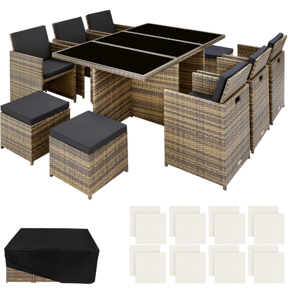 Onze wicker-meubelset is veelzijdig te gebruiken in je tuin, serre, woonkamer of terras. Comfortabele stoelen en een elegante tafel nodigen je uit om heerlijk een paar uur te vertoeven.De set maakt niet alleen indruk met zijn elegante uitstraling en heeft een lange levensduur. Door het lichte gewicht kun je de meubels makkelijk verplaatsen. Toch behouden zij hun maximale stabiliteit door het stalen frame. Het oppervlak van de tafel met de 3 glazen elementen ziet er prachtig uit en is makkelijk te reinigen. De zeer comfortabele beige zitkussens zijn gemaakt van polyester, de kleur is afgestemd op de wicker meubels, en op de achterzijde van de kussens zit een rits, zodat je de bekleding makkelijk schoon kunt maken. Om het kussen tegen vocht te beschermen, is het oppervlak geïmpregneerd. Zo blijft water en vuil niet achter.