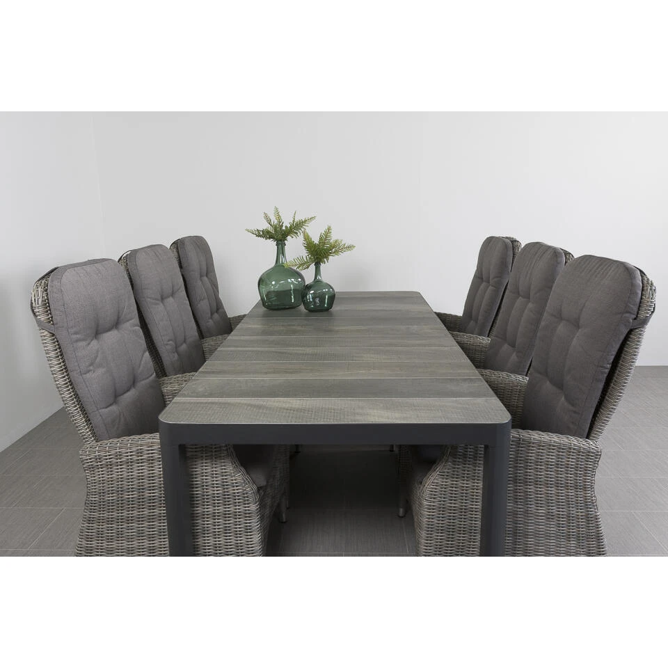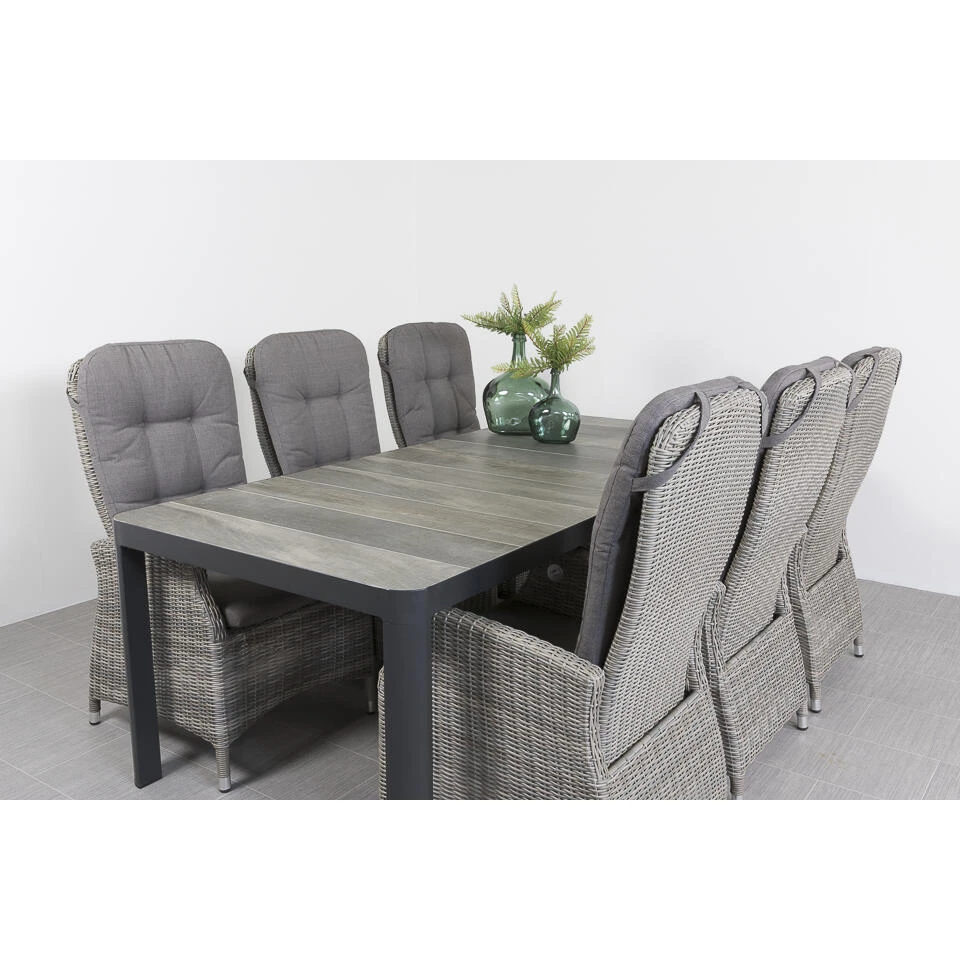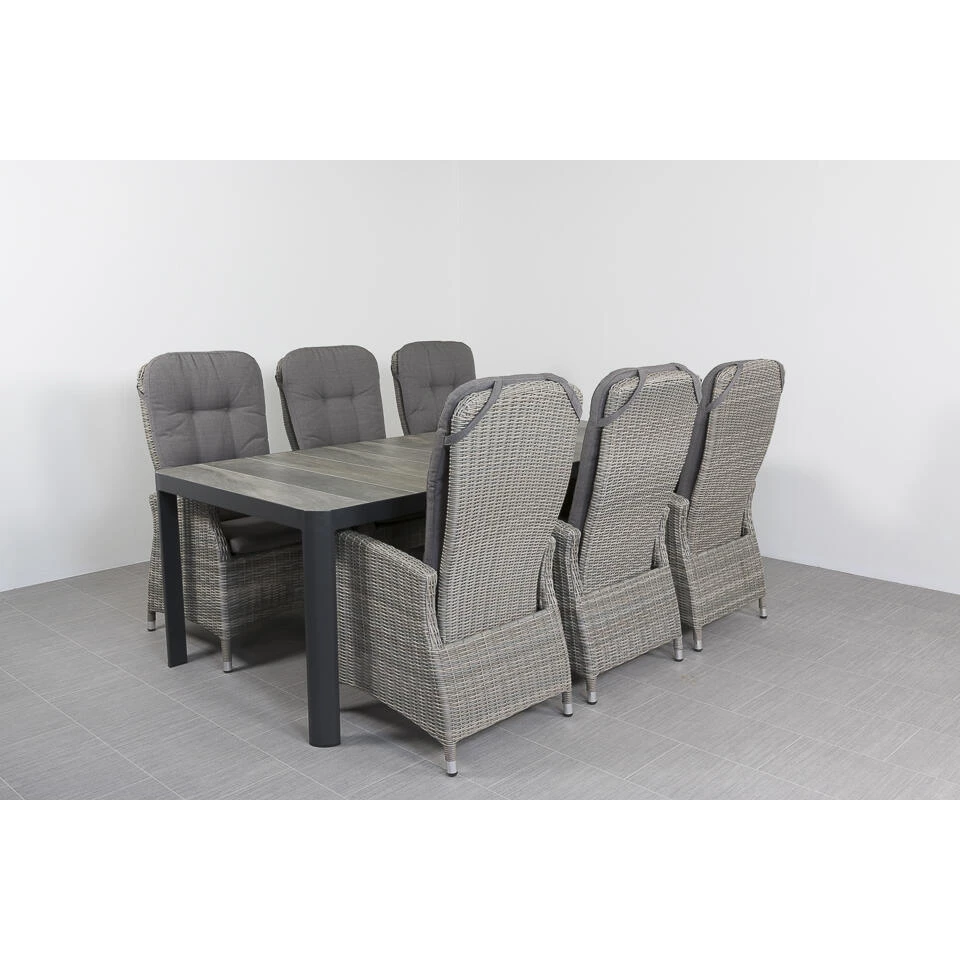 Genieten van een heerlijk diner of een gezellig lunch? Aan de Memphis/Queens tuinset is het allemaal mogelijk. Je kan na het eten zelfs heerlijk uitbuiken in ligstand. Wat wil je nog meer? De tuinset bestaat uit 6 Memphis verstelbare tuinstoelen en 1 Queens tuintafel. Met de afmetingen van 220 x 100 cm. biedt de tafel ruimte aan 6 personen. Je kan er ook voor kiezen om een extra stoel aan de kopse kanten van de tuintafel te plaatsen zodat er ruimte is voor 8 personen.