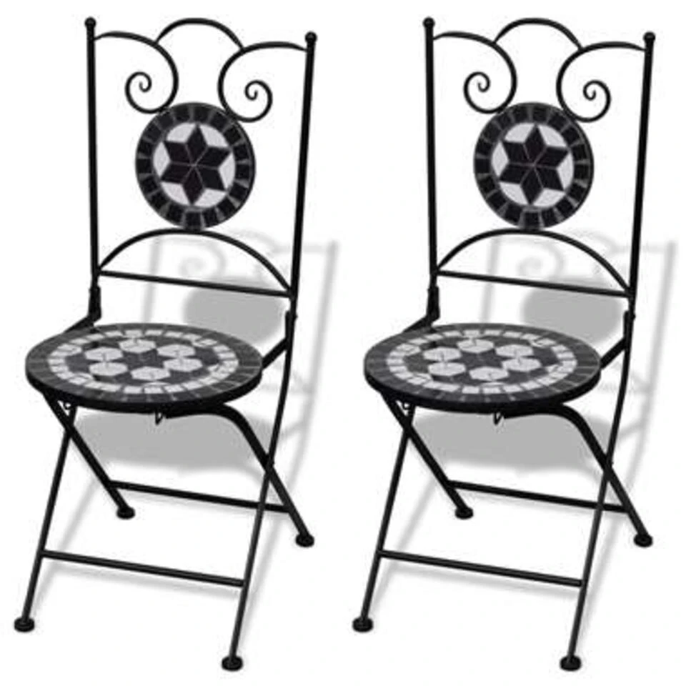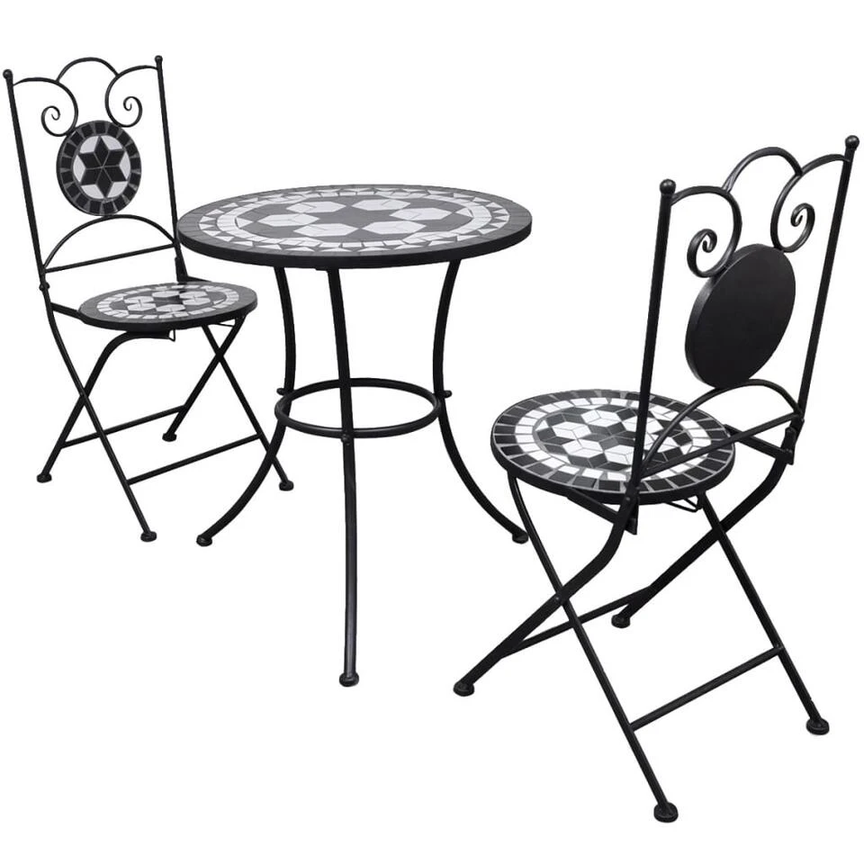 Dankzij het sterke ijzeren frame is de set stevig en duurzaam. De set heeft een waterbestendig keramisch tafelblad en stoelzittingen, waardoor hij eenvoudig kan worden schoongemaakt.