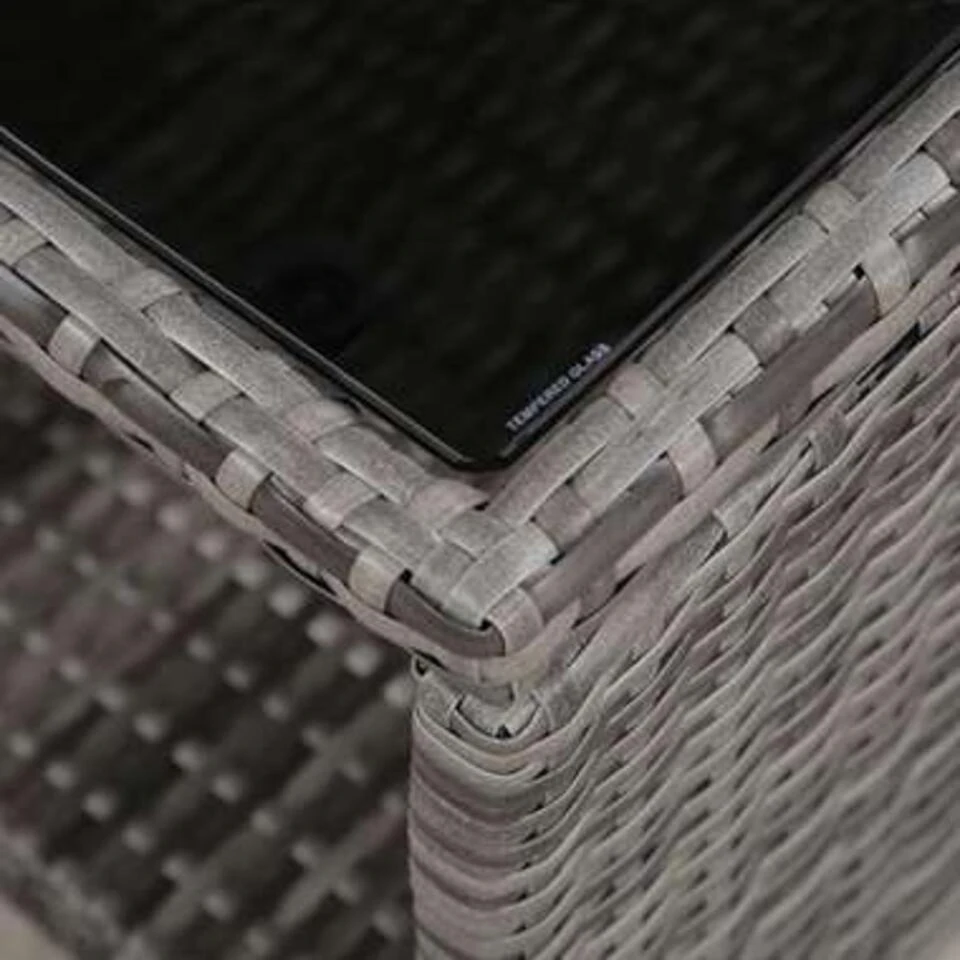 - Materiaal: gepoedercoat stalen frame, glazen tafelblad en PE rattan